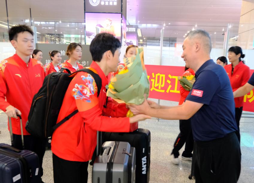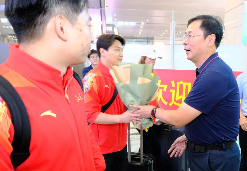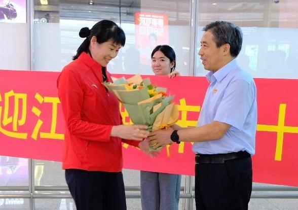 在出站通道处,蹦床队全体队员受到了来自母校师生的热烈欢迎。参与迎接的领导向全体运动员、教练员和管理保障团队送上了鲜花。在迎接仪式上,刘红明对他们在本届全运会上表现出的拼搏精神给予了高度评价,就蹦床队在全运赛场上取得的出色成绩致以了热烈祝贺。