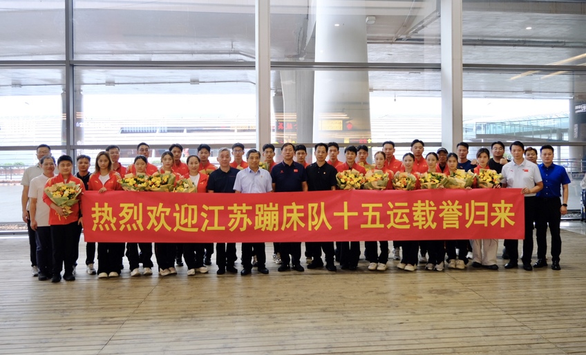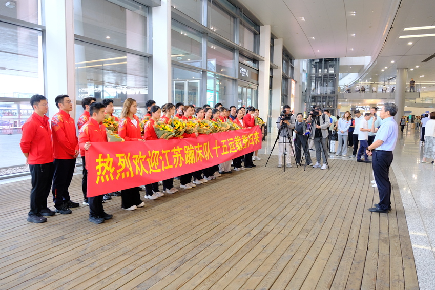 10月13日下午,校党委书记刘红明到南京禄口国际机场迎接凯旋的江苏省蹦床队运动员、教练员及管理保障团队。赴全运会赛场现场指挥的校党委副书记、校长吴兵成,校党委常委、副校长刘健,校党委常委、副校长王猛一行与蹦床队一同抵达南京。