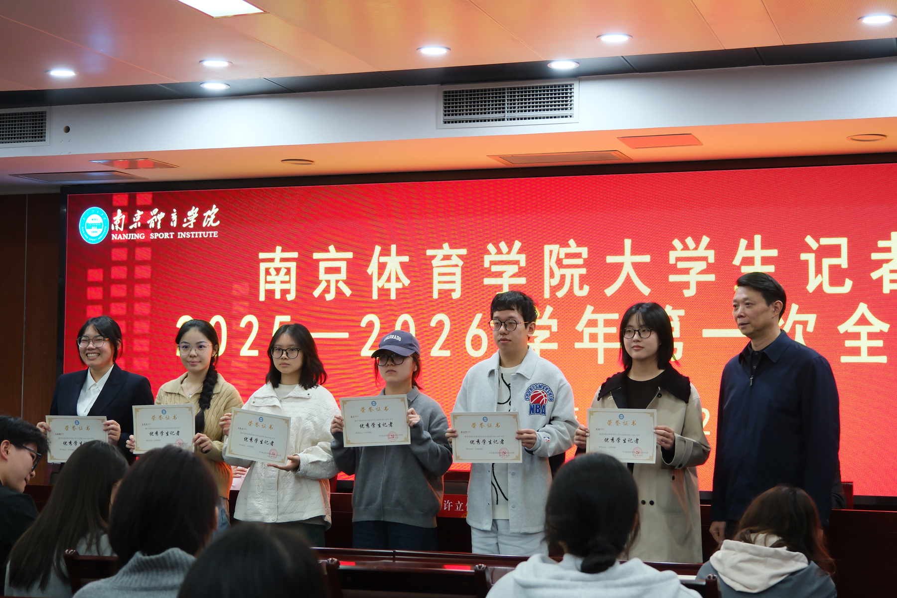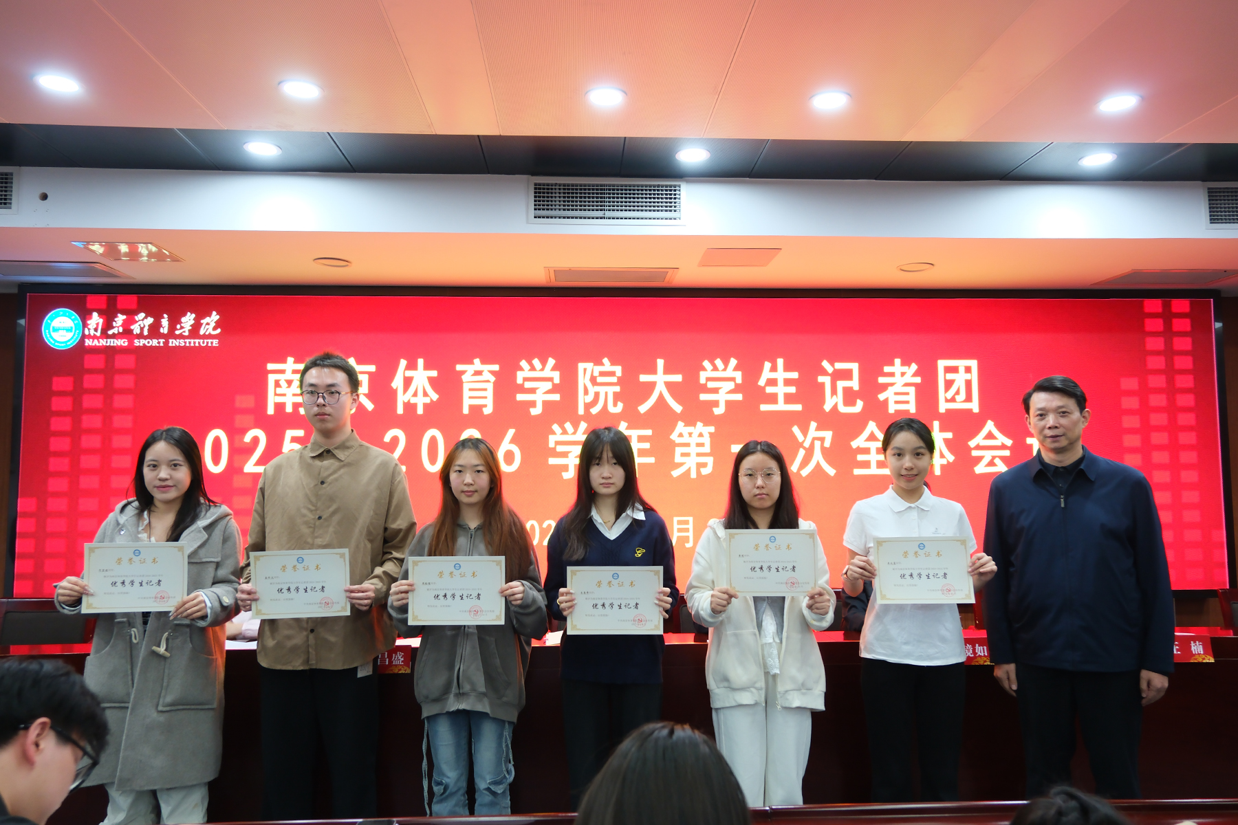 陈镜如宣读了《中共南京体育学院委员会宣传部、共青团南京体育学院委员会关于2025-2026学年大学生记者团主席团的聘任决定》。潘馨雨担任记者团团长(第10任),李浩、朱叶晗、殷雨馨、杨诗琪、温徐灵淇、毛瑜璇担任记者团副团长,王洋洋、王韵洁担任记者团团长助理。