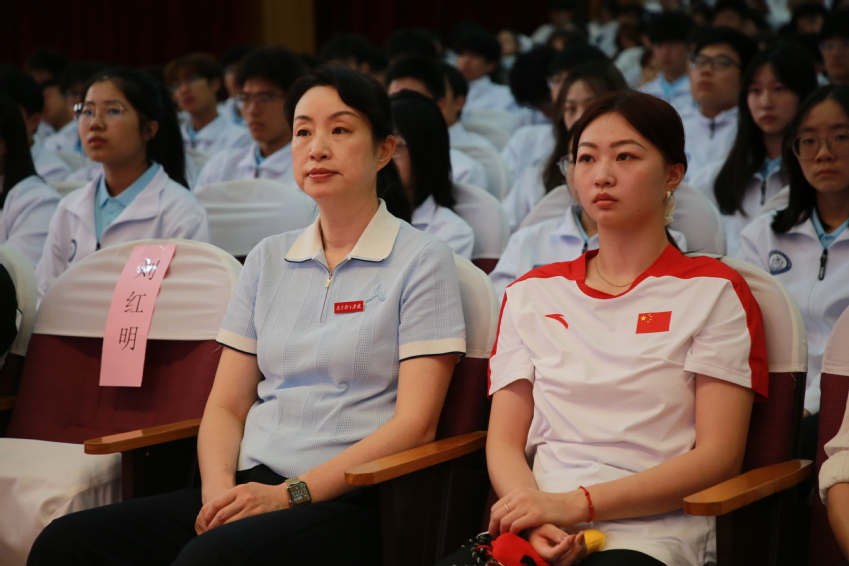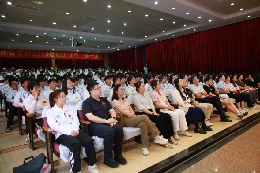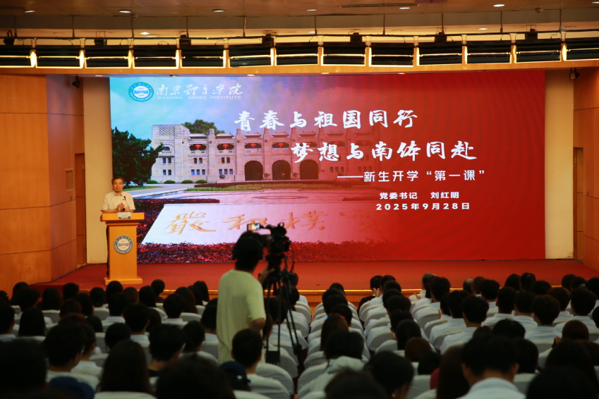 四时俱可喜,最好新秋时。9月28日上午,南京体育学院2025级新生开学“第一课”在灵谷寺校区图书馆报告厅举行。党委书记刘红明以《青春与祖国同行梦想与南体同赴》为题,为全校新生授课。党委常委、副校长鲍勤,研究生工作处处长孙国友,2004年雅典奥运会冠军陈玘和2024年巴黎奥运会冠军郝婷出席活动。本次授课采取线下、线上相结合的形式,主会场设置在灵谷寺校区图书馆报告厅,分会场设置在仙林校区C301教室,其余新生以班级为单位组织观看。学生工作处、各高等教育二级学院分管学生工作的副书记与分团委书记参加活动。