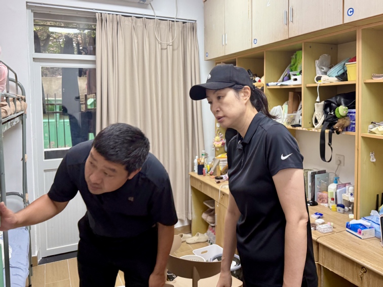 鲍勤走访军训现场后带队赴学生公寓检查学生宿舍。