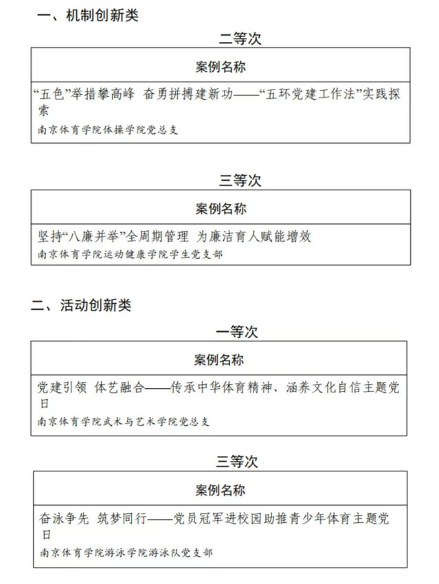 近日,江苏省委教育工委公布2023—2024年度江苏高校党建工作创新案例评选结果(苏委教组函〔2025〕39号),我校推荐上报的4个案例全部入选。其中,武术与艺术学院党总支《党建引领体艺融合——传承中华体育精神、涵养文化自信主题党日》获得活动创新类案例一等次;体操学院党总支《“五色”举措攀高峰奋勇拼搏建新功——“五环党建工作法”实践探索》获得机制创新类案例二等次;运动健康学院学生党支部《坚持“八廉并举”全周期管理为廉洁育人赋能增效》和游泳学院游泳队党支部《奋泳争先筑梦同行——党员冠军进校园助推青少年体育主题党日》分别获得机制创新类案例和活动创新类案例三等次。