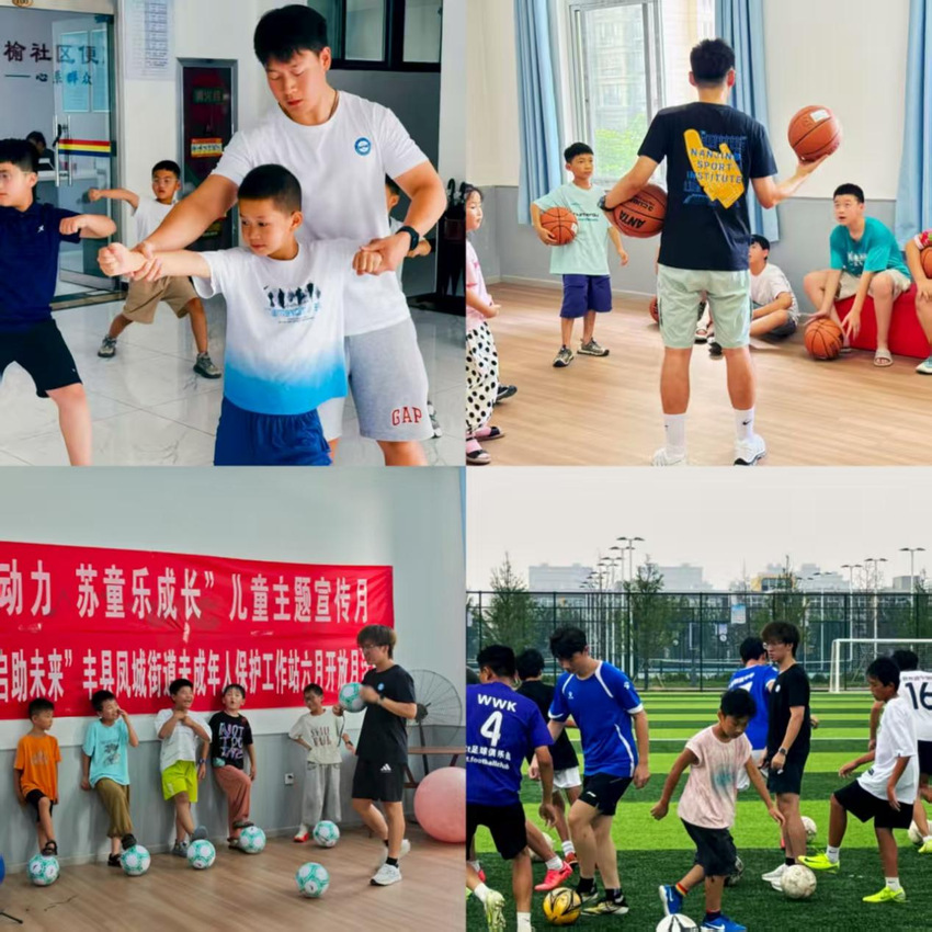 团队聚焦“五育并举”育人目标,为社区儿童量身打造“体育+”暑期公益课堂,以推普为纽带串联德育铸魂、智育启慧、体育强基、美育润心。团队创新编排舞蹈课程《青春再出发》,让肢体语言成为诠释新时代少年精神气象的美育载体;精选诵读《少年中国说》《月光下的中国》,在声浪铿锵中筑牢家国情怀与民族认同的精神基座;精心创作以开合跳、高抬腿等基础动作为内容的活力健身操,使身体律动成为感知体育之美的动态课堂。足、篮球课上,团队通过设计“趣味传球赛”“分组对抗赛”,在攻防转换中帮助学生切身感受“团结协作、拼搏进取”的体育精神。此外,团队成员还应丰县体育中心特邀为其足球专项进行指导,以专业力量浇灌基层体育苗圃。