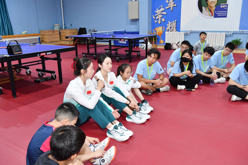 在交流环节,奥运冠军陆春龙与香港青年们围坐一堂,分享个人运动生涯和心路历程。香港青年踊跃提问,冠军一一解答,现场气氛热烈,笑声与掌声交织。奥运冠军陈玘则是与香港青年一起分享“国球”快乐,进行球艺交流指导,带领大家近距离感受乒乓球运动的魅力和体育精神的力量。除此之外,两地青年学生还围绕“体育精神与青年担当”展开了深度对话,2025年成都世界运动会技巧冠军丁雯妍、顾荃佳、马一星一同参加了交流座谈。不同的口音交织,化作欢快的音符,诉说着彼此的趣事。虽来自两个地方,但这份情谊如同纽带,将他们紧紧相连,共同书写两地友好交流的温暖篇章。
