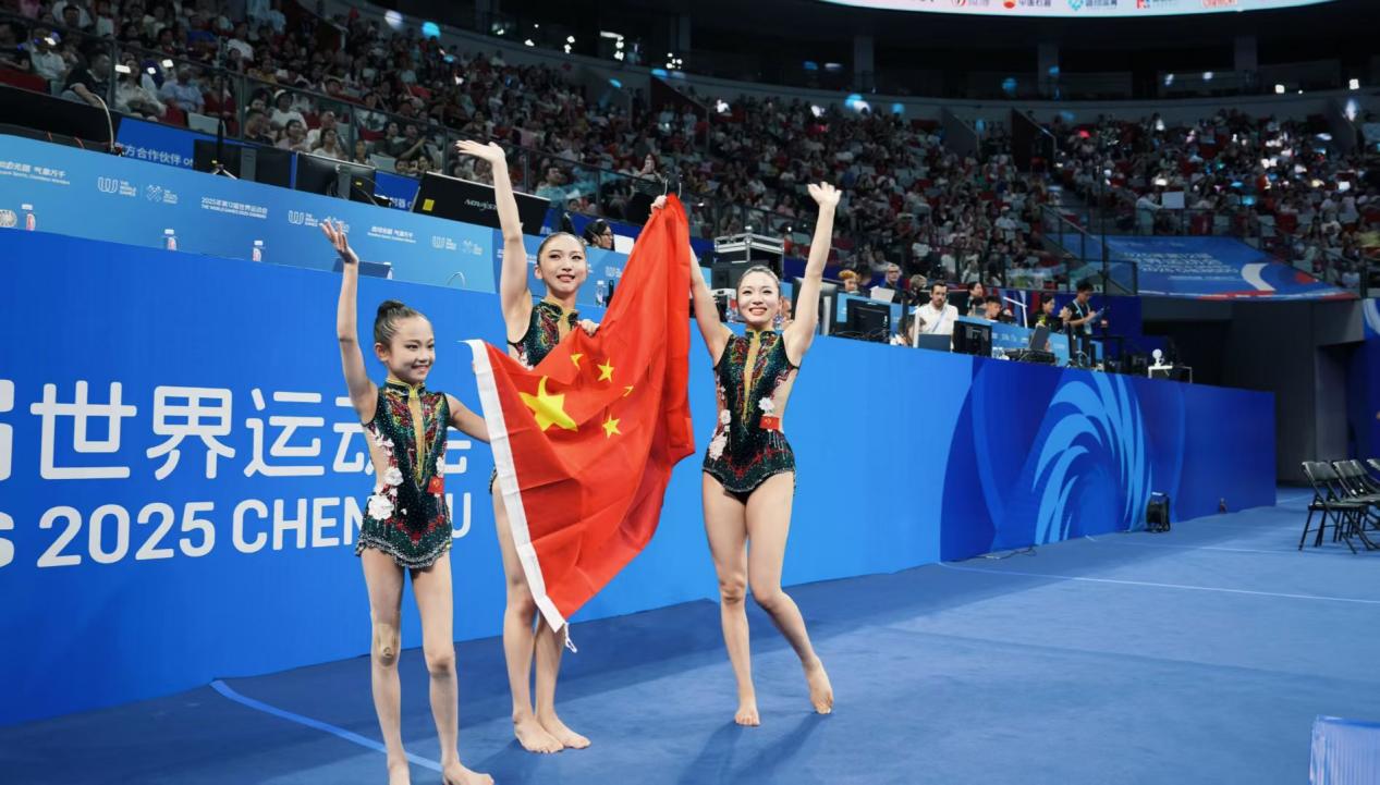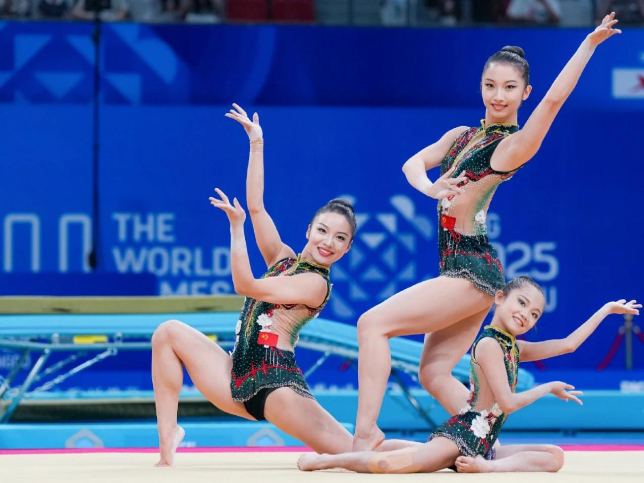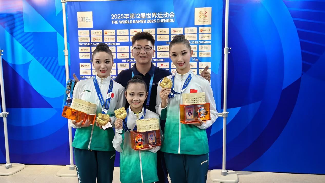 一套行云流水高难度的《茉莉花》,不时赢来阵阵欢呼,在展现高难度的动作时,观众们不禁为姑娘们捏了把汗。由江苏省技巧队运动员丁雯妍、顾荃佳、马一星组成的中国队演绎的这首江苏民歌,最终获得了29.230分,将技巧集体(女三)项目金牌收入囊中。这是第12届世界运动会中国体育代表团收获的第四枚金牌,更是中国技巧女子三人项目在世界运动会上获得的首金。
