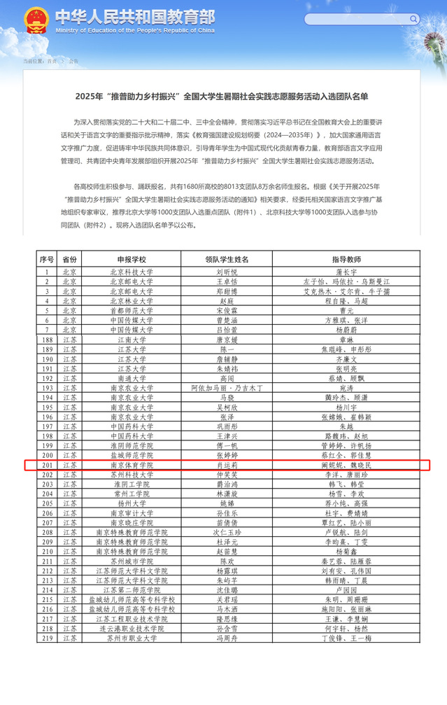 近日,教育部公布了《2025年“推普助力乡村振兴”全国大学生暑期社会实践志愿服务活动入选团队名单》。经专家评审,由我校江苏省普通话测试员、运动健康学院党总支书记阚妮妮和运动健康学院团委副书记、辅导员魏晓民共同指导,肖运莉等15名同学参与的“声”体力行——推普助力乡村振兴志愿服务团队成功入选参与协同团队。这也是我校第4次入选该项目实践活动。活动自启动以来,共有全国1680所高校的8013支团队8万余名师生报名,2000支团队入选。