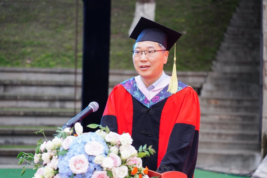 陈爱国代表学校向运动健康学院2025届毕业生表示热烈的祝贺,向全体毕业生的师长亲友表示崇高的敬意,向始终关心和支持学院发展的广大校友及社会各界朋友表示衷心的感谢。他将运动健康学院“融学训研、求知信行”这一独特的院风精神凝练为三点期望与毕业生们共勉:一是坚定理想信念,深入践行“强国有我”。希望同学们能够保持对体育的热爱和对健康事业的追求,积极践行“运动促进健康”理念,主动服务“体育强国”“健康中国”国家战略,以炽热之心把青春奋斗融入党和人民事业。二是永葆求知之心,倾力书写“无悔人生”。希望积极拓宽视野的广度、夯实知识的厚度、提升能力的宽度,真正掌握与时代同频共振的核心竞争力,在变革浪潮中把握人生主动权。三是牢记奋斗成事,争做新时代“栋梁之才”。希望大家做好当下该做的事,相信自己,耐得住平凡,乐观一点,扛得住压力,豁达一点,经得起挫折,让人生的每一步都走得坚实。