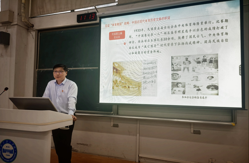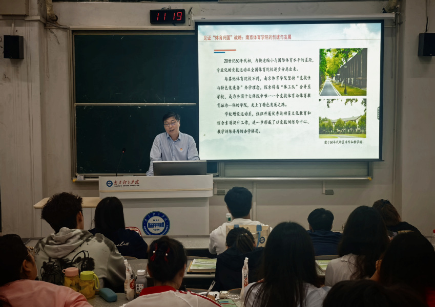 课上,陈爱国梳理解析了中国共产党领导下我国体育事业的发展历程,我校以近现代百年体育文脉的传承发展,特色办学之路的赓续变迁,见证并参与了这一历史进程。100多年来,从站起来、富起来到强起来,中国共产党始终站在实现中华民族伟大复兴的战略高度重视体育事业发展。从“体育救国”到“体育兴国”,再到“体育报国”,直至当前“体育强国”新战略,走出了一条中国特色社会主义体育发展之路,推动着新时代中国特色社会主义体育事业不断前行。南京体育学院秉承中华体育文脉,在长期的办学实践中,探索形成了独树一帜的教学、训练、科研“三位一体”的“南体模式”,肩负“为党育人、为国育才”神圣使命和“为国争光、为省添彩”光荣职责,先后培养了以18位奥运冠军、121位世界冠军为代表的竞技体育精英人才和数以万计的体育领域专业人才,被誉为“世界冠军的摇篮”“体教融合的典范”。