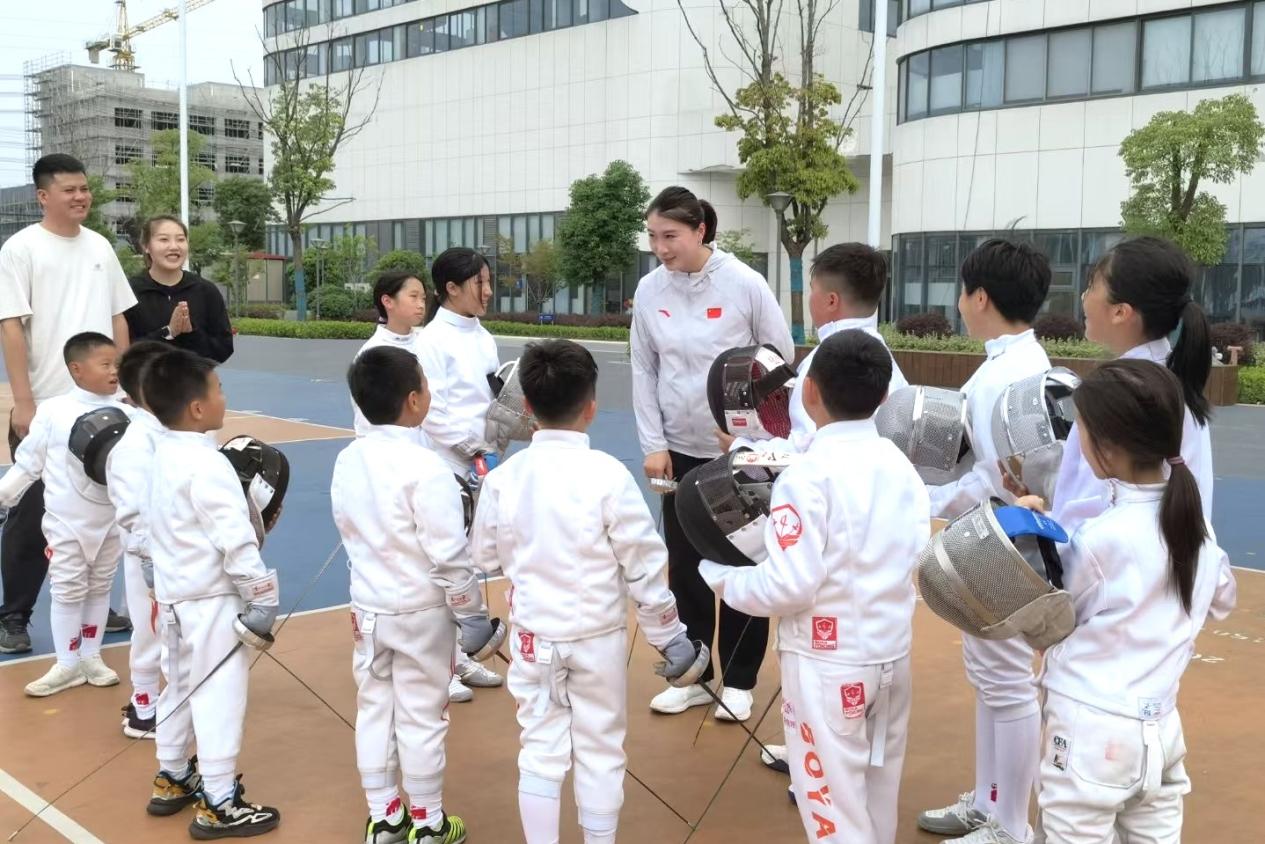 击剑奥运冠军许安琪现场指导击剑社团的小朋友