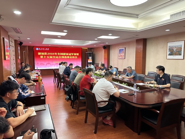 5月28日上午,游泳学院游泳队在行政办公楼301会议室召开2025年全国游泳冠军赛暨第十五届全运会预选赛总结会。党委副书记、校长吴兵成,党委常委、副校长刘健,省体育局竞体处副处长孟洁出席会议。训练处有关负责同志、游泳队全体管理干部、一线教练员、体能教练和队医参加会议。会议由游泳学院院长王伟新主持。