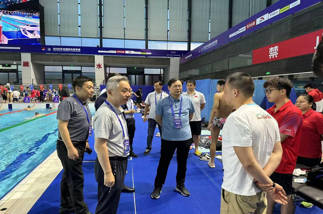 吴兵成一行来到赛区休息区,听取了游泳队比赛情况汇报,与全体参赛教练员、科医保障人员进行了亲切交谈,详细询问了张雨霏、董志豪等重点运动员的备战参赛情况、身体状况、医疗保障、困难和需求等,并勉励全体参赛队员在比赛中咬定目标、全力以赴,充分展现竞技实力与精神风貌。同时叮嘱大家注意防伤防病,做好赛风赛纪和反兴奋剂相关工作。