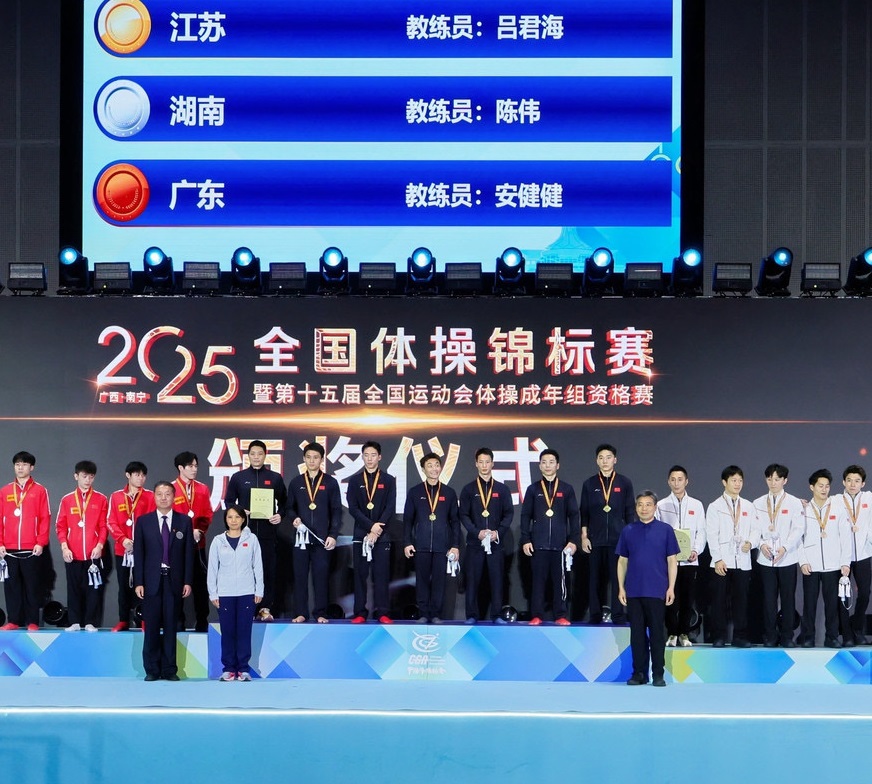 5月17日下午,2025年全国体操锦标赛暨第十五届全运会成年组资格赛男子团体决赛在广西省南宁市三塘体育训练比赛基地体育馆正式开赛。来自全国的23个代表队、280名运动员参加比赛,最终江苏体操队以总分323.392获得男子团体冠军,实现全国一类赛男子团体六连冠。湖南队以316.492分获得第二名,广东队以313.393分获得第三名。