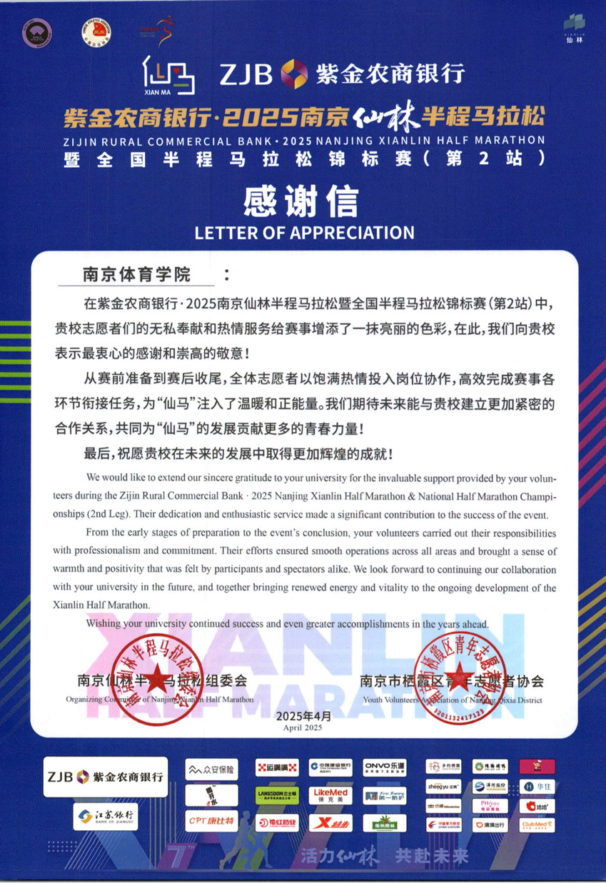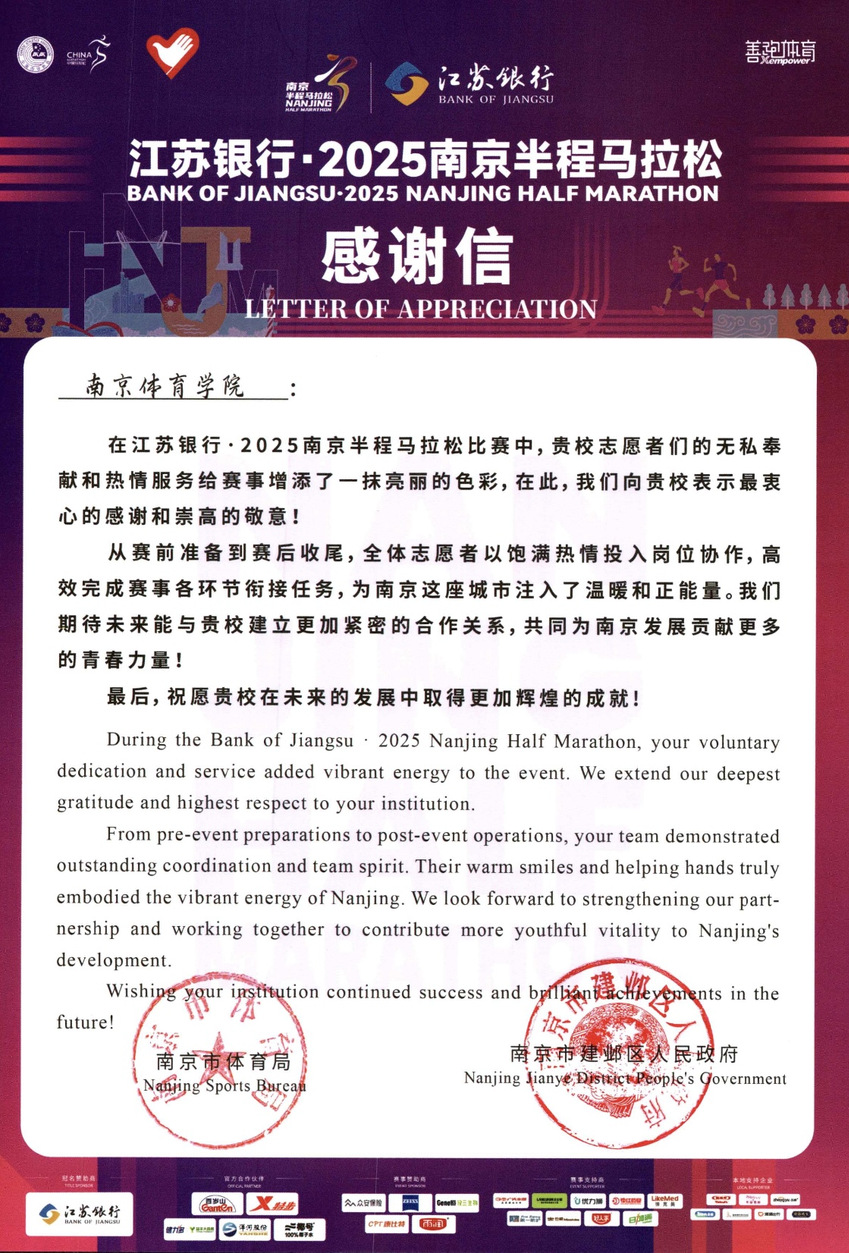 近日,南京半程马拉松、南京仙林半程马拉松组委会向我校发来感谢信,感谢南京体育学院志愿者在2025年对南京半程马拉松、南京仙林半程马拉松比赛工作的支持与助力。