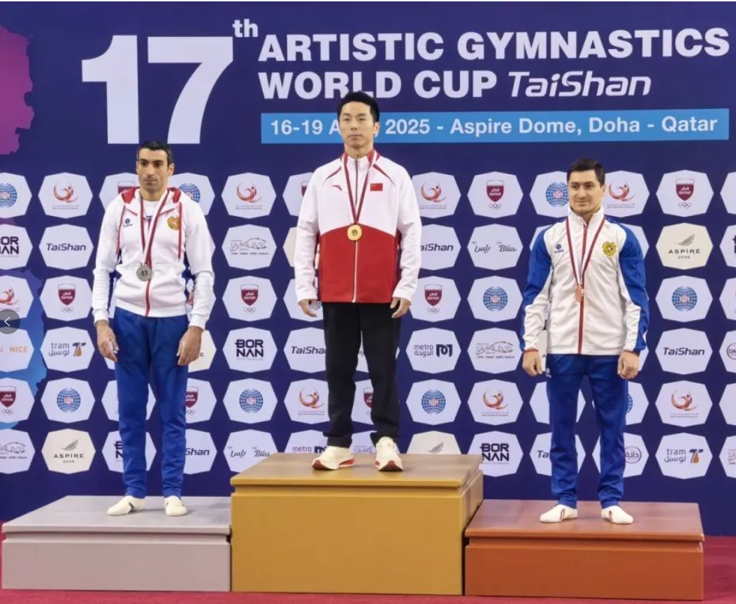 首次参加世界杯赛的19岁小将洪延明以14.666分摘得鞍马银牌。