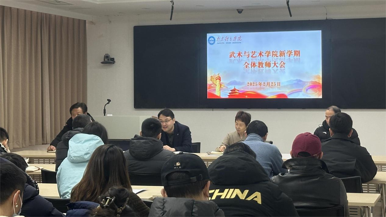 为进一步增强全院教职工的凝聚力,科学合理地规划新学期工作安排,2025年2月25日,武术与艺术学院在图书馆第二报告厅召开2024-2025学年第二学期第一次全体教师大会。校党委常委、纪委书记、派驻监察专员刘海宁出席会议。会议由学院党总支书记叶瑛主持,全体教职工参加。