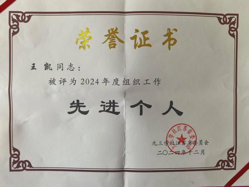 近日,九三学社江苏省第九届委员会第五次全体会议在南京召开。会议深入学习贯彻中央经济工作会议精神和九三学社十五届三中全会精神,听取并审议了九三学社江苏省第九届委员会常委会2024年工作报告,表彰了2024年先进集体和先进个人。九三学社南体支社主委王凯教授荣获2024年度“组织工作先进个人”称号。