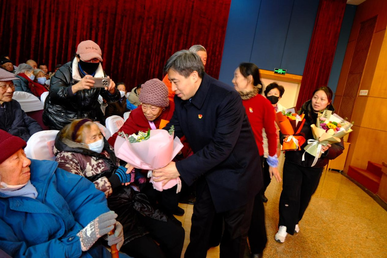 党委书记刘红明向到场的6位长寿老人代表颁发了鲜花和慰问金。