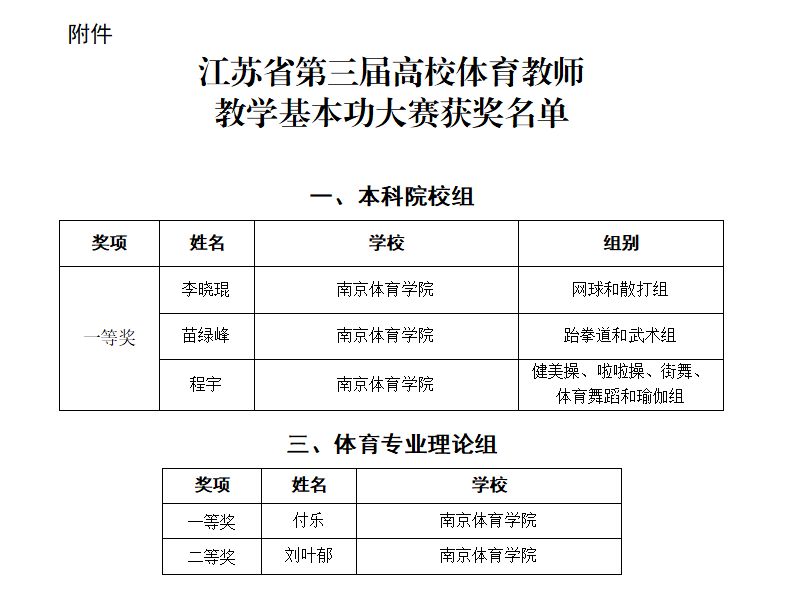 近日,江苏省第三届高校体育教师教学基本功大赛成绩正式揭晓。我校成绩斐然,5名参赛教师悉数获奖,其中李晓琨、苗绿峰、程宇3位老师获本科院校组一等奖,付乐老师获体育专业理论组一等奖,刘叶郁老师获体育专业理论组二等奖,获奖数和获奖等级均位居全省本科院校首位,充分展示了我校体育教师扎实的专业素养和过硬的教学能力。