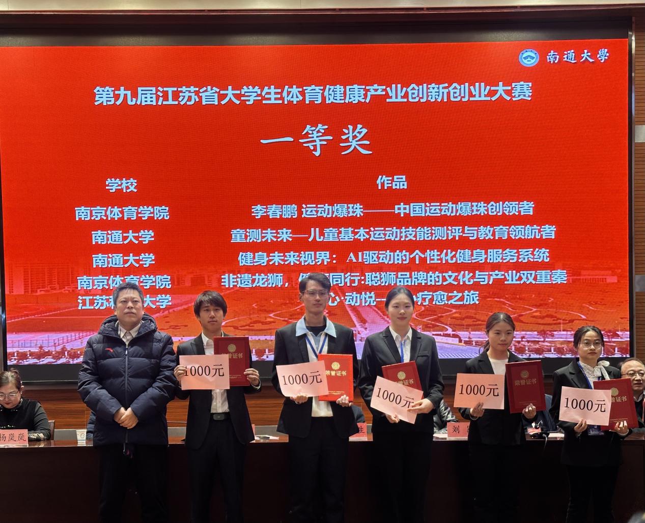 2024年12月13-15日,由江苏省大学生体育健康产业创新创业联盟、江苏省学校体育教学指导委员会主办,南通大学体育科学学院、南通市经开区科技镇长团承办的第九届江苏省大学生体育健康产业创新创业大赛在南通大学啬园校区盛大举办。本次大赛吸引了中国矿业大学、江苏科技大学、南京师范大学等14所省内高校31个项目团队参与。在我院江山教授和吴平平副教授的悉心指导下,2021级表演专业吴梓聪同学主创的《非遗龙狮,健康同行:聪狮品牌的文化与产业双重奏》项目,凭借团队出色的表现,赢得了现场评委和观众的一致好评,最终成功斩获大赛一等奖,两位指导老师荣获最佳指导教师奖,展现出了卓越的团队精神和专业素养。