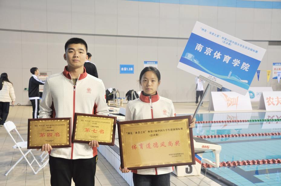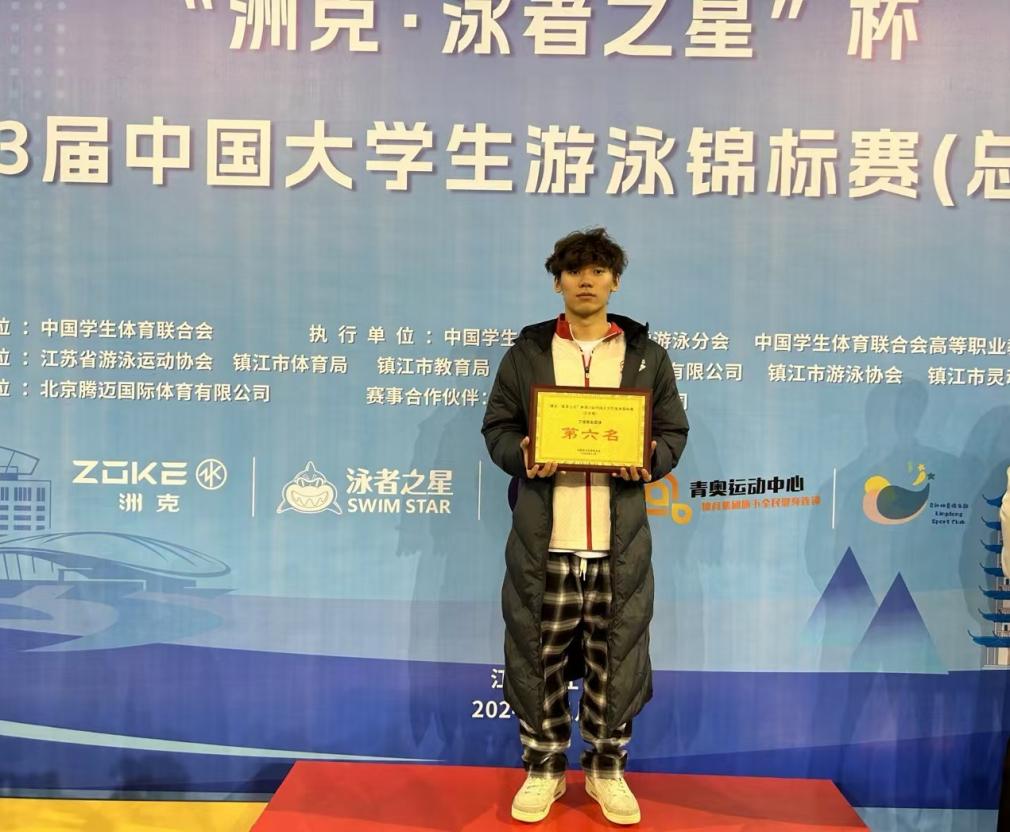 11月25日-11月30日,由中国学生体育联合会、镇江市体育局主办的第23届中国大学生游泳锦标赛总决赛于镇江市体育会展中心综合训练馆正式开幕,本次比赛共有包括清华大学、北京大学在内的150所高校参赛,1500多名参赛人员。本次比赛为期5天,分为甲组、乙组、丙A、丙B组、丁组5个组别,共设185个项目。本次比赛参与的高校及人数再创新高,运动员中不乏奥运会冠军选手,赛事举办对于检验各高校游泳运动员训练水平,提升运动员竞技状态和能力具有一定意义。我校运动训练学院游泳队由陆青老师、马劼老师带队,共9名学生运动员参与比赛。经过激烈的角逐,获得3银4铜的成绩;获得丁组男子团体第四名,丁组男女团体第六名的成绩,并荣获体育道德风尚奖。