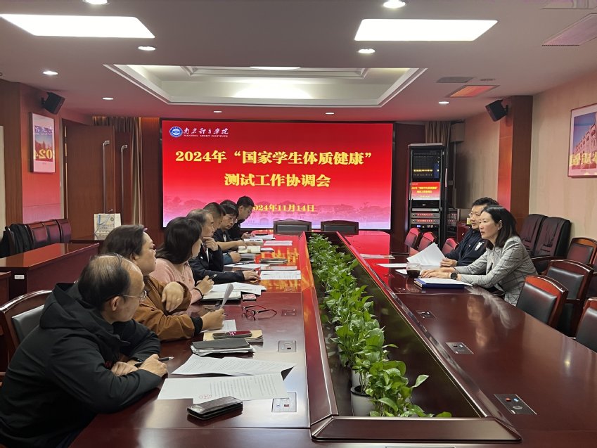 11月14日上午,我校2024年“国家学生体质健康”测试作协调会在301会议室召开。党委常委、副校长肖爱华出席会议并讲话,教务处、学工处、后勤处、校医院、仙林校区管委会以及各高等教育二级学院副书记参加会议,会议由教务处副处长李强主持。