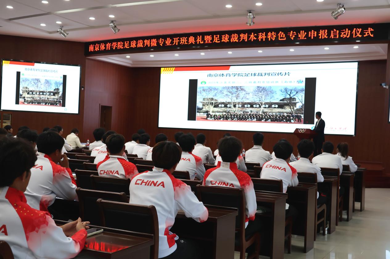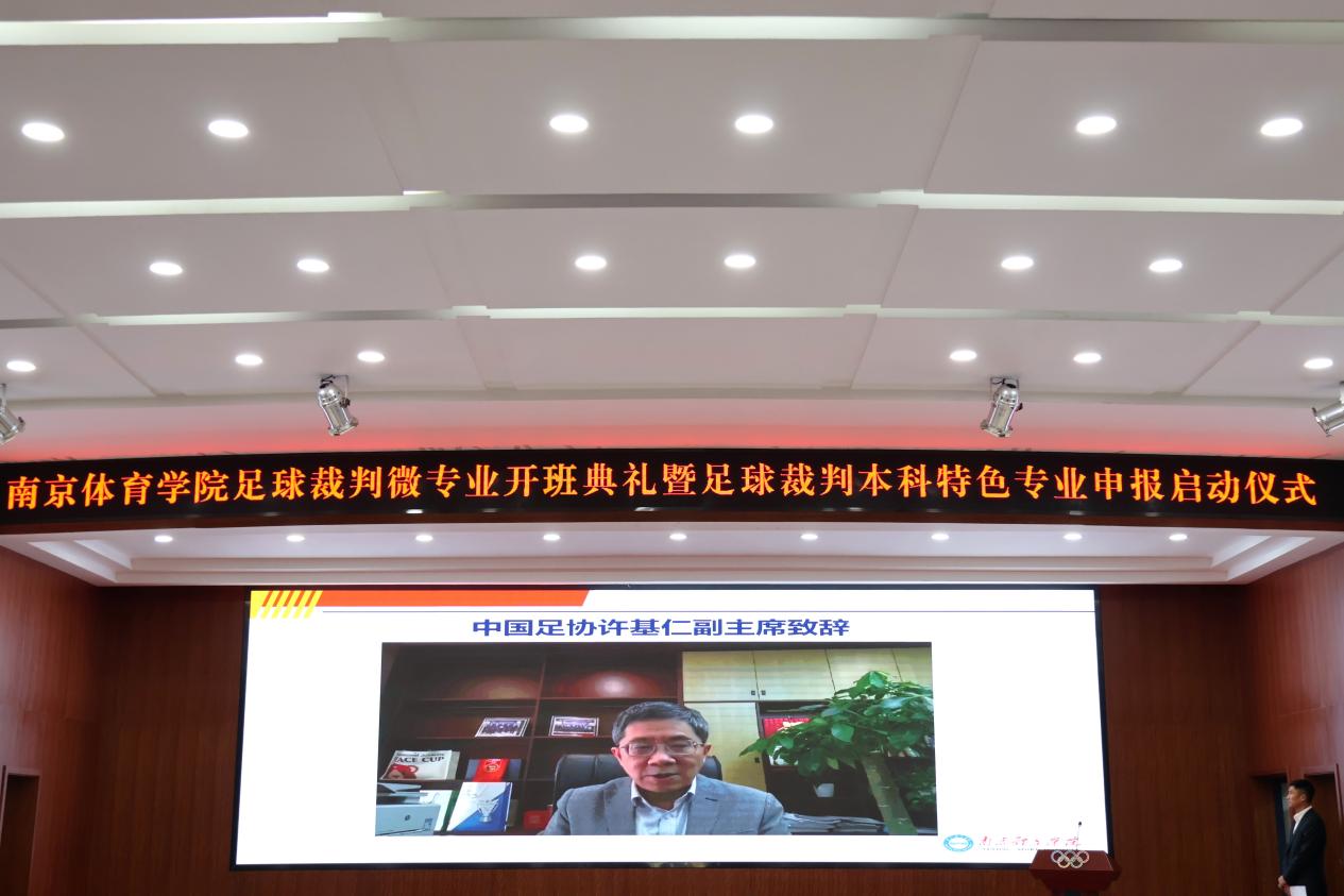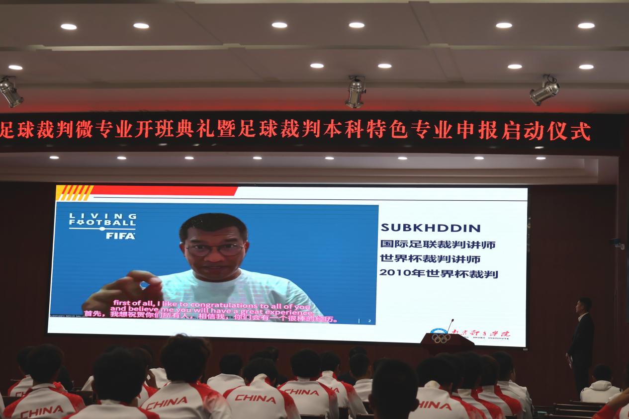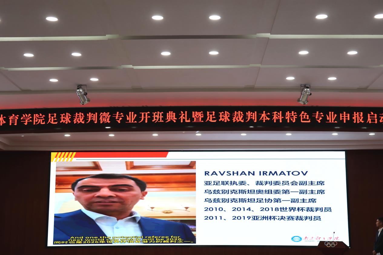 南京体院足球裁判微专业和特色专业的建设不仅得到了中国足协、江苏省教育厅、江苏省体育局的深切关心和鼎力支持,同时还得到了国际组织和国际友人的关注。亚足联执委、裁判委员会副主席、乌兹别克斯坦奥组委和足协第一副主席IRMATOV发来视频贺词。他说,裁判工作并不容易,你们未来可能代表国家参加比赛,这是一件非常荣耀的事。他希望所有学员都能像马宁一样,为成为世界顶级裁判而奋斗。国际足联裁判讲师SUBKHDDIN先生在贺词中说,足球是世界性的产业,作为裁判员要理解足球、热爱足球,更要努力为足球运动做贡献。他希望所有学员们能尽己所能、为梦想而努力。