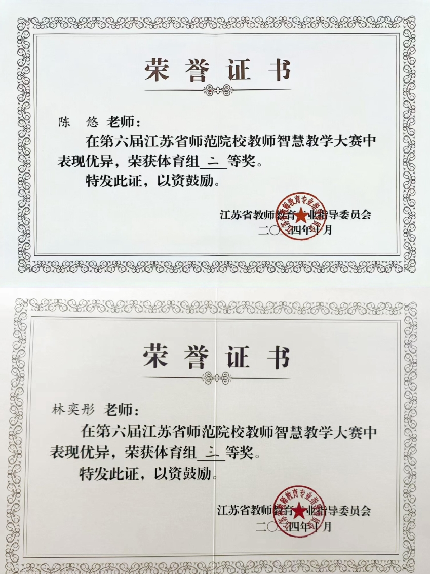 10月18至20日,第六届江苏省师范院校教师智慧教学大赛决赛在南京师范大学举行。经过激烈的角逐,我校体育教育与人文学院教师陈悠获体育组二等奖,武术与艺术学院教师林奕彤获体育组三等奖。