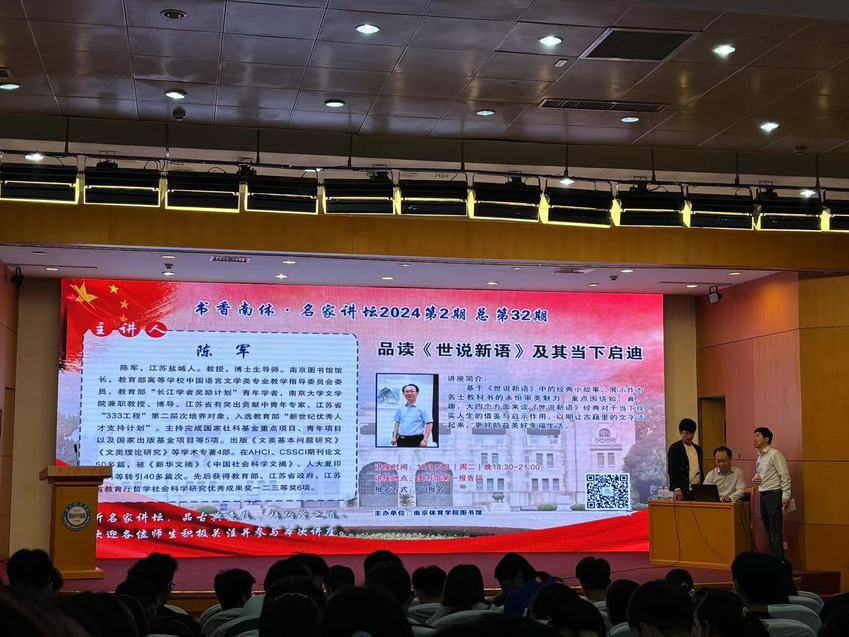 10月15日晚,南京体育学院图书馆有幸邀请到南京图书馆馆长,教育部高等学校中国语言文学类专业教学指导委员会委员,教育部“长江学者奖励计划”青年学者,南京大学文学院兼职教授、博导,扬州大学文学院原院长陈军老师莅临我校图书馆报告厅,开展了一场题为“品读《世说新语》及其当代启迪”的精彩讲座。附属学校语文教研组的青年教师们积极参与,齐聚图书馆,认真聆听并学习了讲座内容。