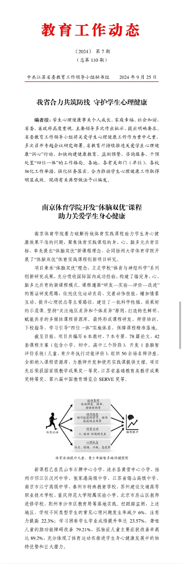 9月25日《教育工作动态》【2024】第7期(总第110期)刊发了“南京体育学院开发‘体脑双优’课程助力关爱学生身心健康”的成果要报。