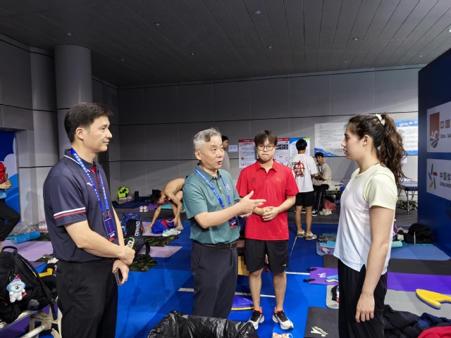 刘健一行来到赛区休息区,详细询问了比赛赛程安排,听取了游泳队备赛情况和比赛成绩的汇报,与重点运动员张雨霏、董志豪、杨雯文等和全体参赛教练员、科医保障人员进行了亲切交谈,详细询问了他们的备战参赛情况、身体状况、医疗保障、困难和需求等,并鼓励全体参赛人员在后续比赛中以最佳竞技状态赛出成绩、赛出水平、赛出风格。同时叮嘱大家注意防伤防病,做好赛风赛纪和反兴奋剂相关工作。