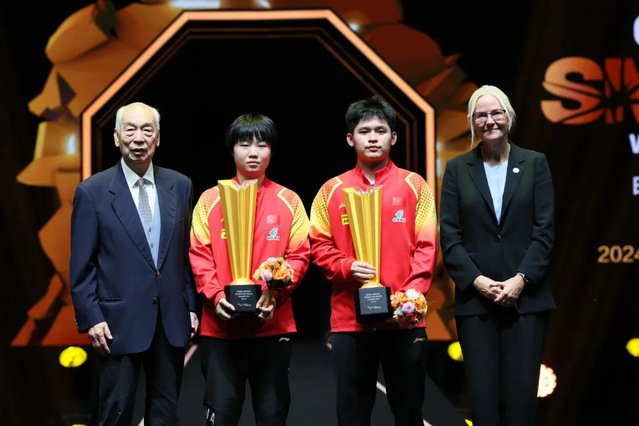 10月4日晚,在北京首钢园进行的WTT世界乒联中国大满贯混双决赛中,乒羽学院乒乓球队运动员蒯曼搭档林诗栋以3比1战胜队友林高远/王艺迪,夺得冠军。