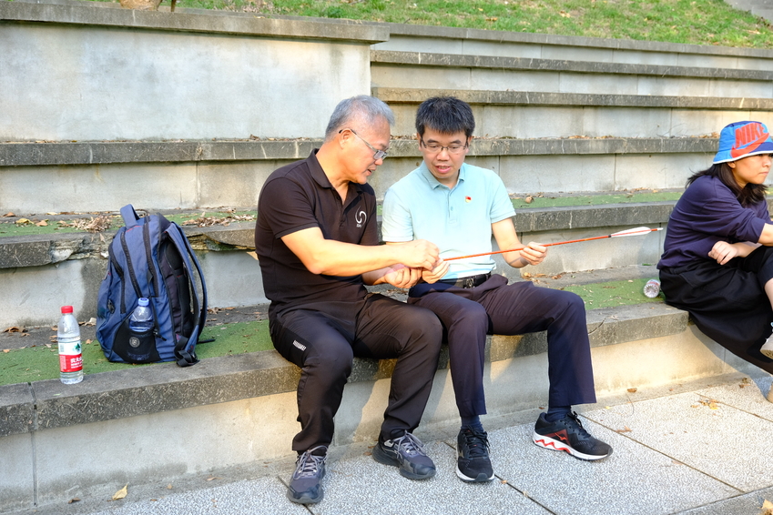 党委副书记兰亚明在拍摄现场体验传统武器