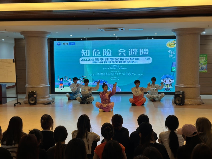 为进一步增强我校与属地公安机关的交流与合作,提升学生道路交通安全风险防范意识、守法意识,预防和减少学生交通事故的发生,共同为校园安全、交通秩序做出积极贡献,9月13日下午,南京市公安局交通管理局第一大队、第三大队、机动大队联合哈啰打车举办的“知危险 会避险”2024秋季开学交通安全第一课暨中秋假期前交通安全提示活动在我校体育馆举行。校保卫处、武术与艺术学院承办此次活动,校党委副书记兰亚明出席活动并致欢迎辞。