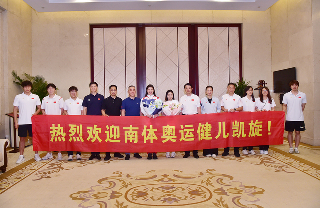 8月22日晚,南体游泳奥运冠军张雨霏、科医保障人员方芳载誉回到南京,受到南京体育学院领导和相关人员的热烈欢迎。