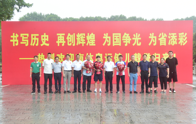 党委书记刘红明,党委常委、纪委书记、派驻监察专员周和林,党委常委、副校长刘健,党委常委、党委宣传部部长、党委统战部部长许立俊,党委常委、党政办主任王猛,乒羽学院院长冀方新,乒羽学院党总支副书记吴晓明,党政办副主任苏阳,训练处副处长宋凯,乒羽学院副院长孔庆玮,省羽毛球队副总教练兼女子一线主教练刘永等在办公楼前欢迎何冰娇、张军和孙俊凯旋并亲切交流。刘健、许立俊、冀方新、吴晓明、苏阳、宋凯、孔庆玮、刘永等到南京南站迎接。