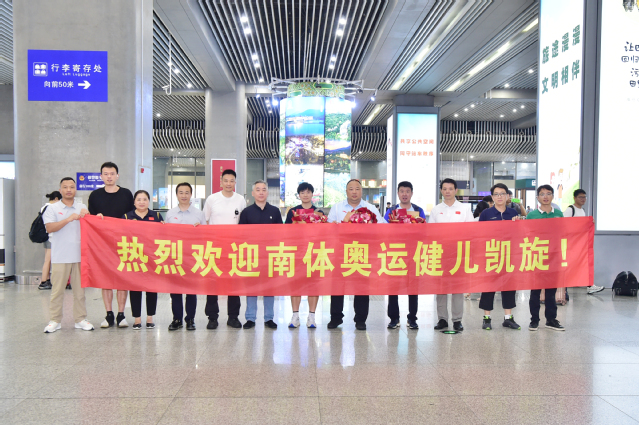 8月21日中午,刚刚参加完党和国家领导人接见的巴黎奥运会羽毛球女单亚军何冰娇,副校长、中国羽毛球协会主席张军和教练员孙俊载誉回到南京体育学院,受到学校领导和相关人员的热烈欢迎。