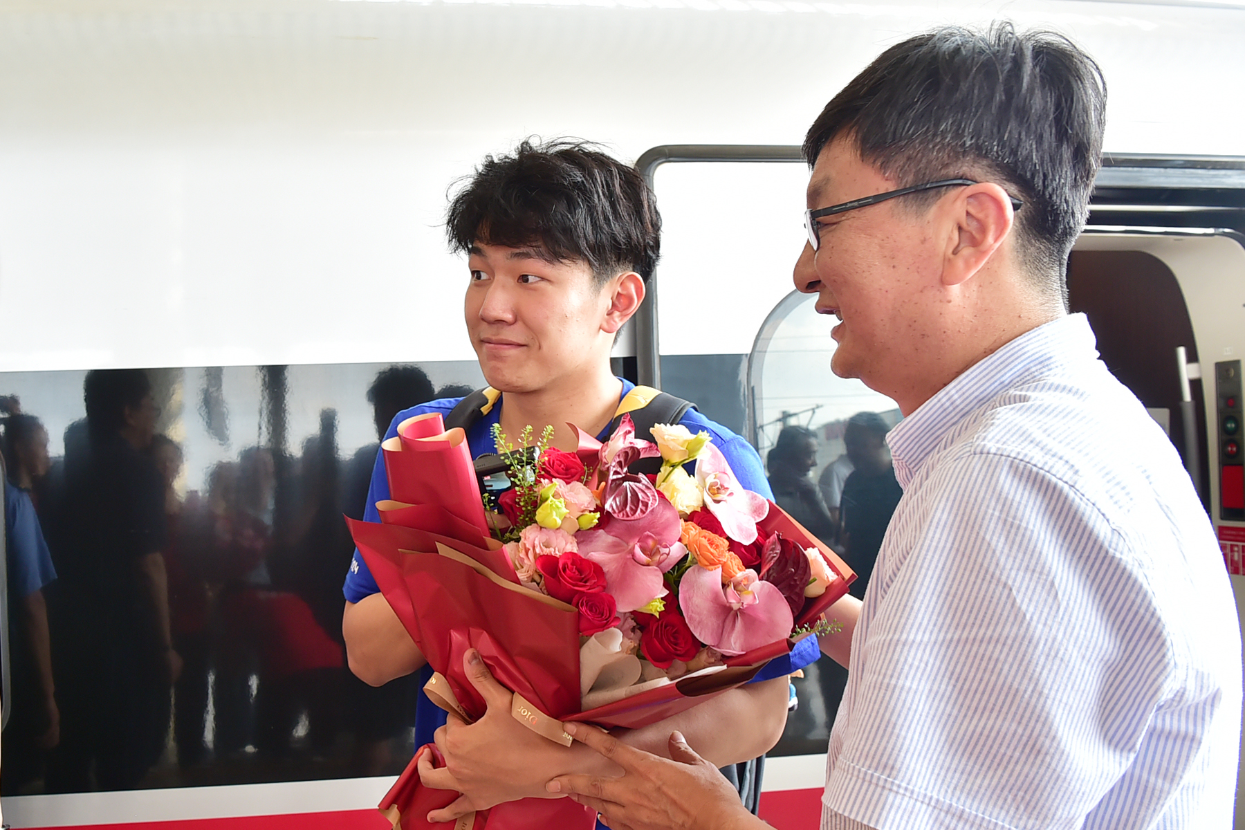 南京体育学院校长杨国庆到南京南站迎接南体奥运健儿