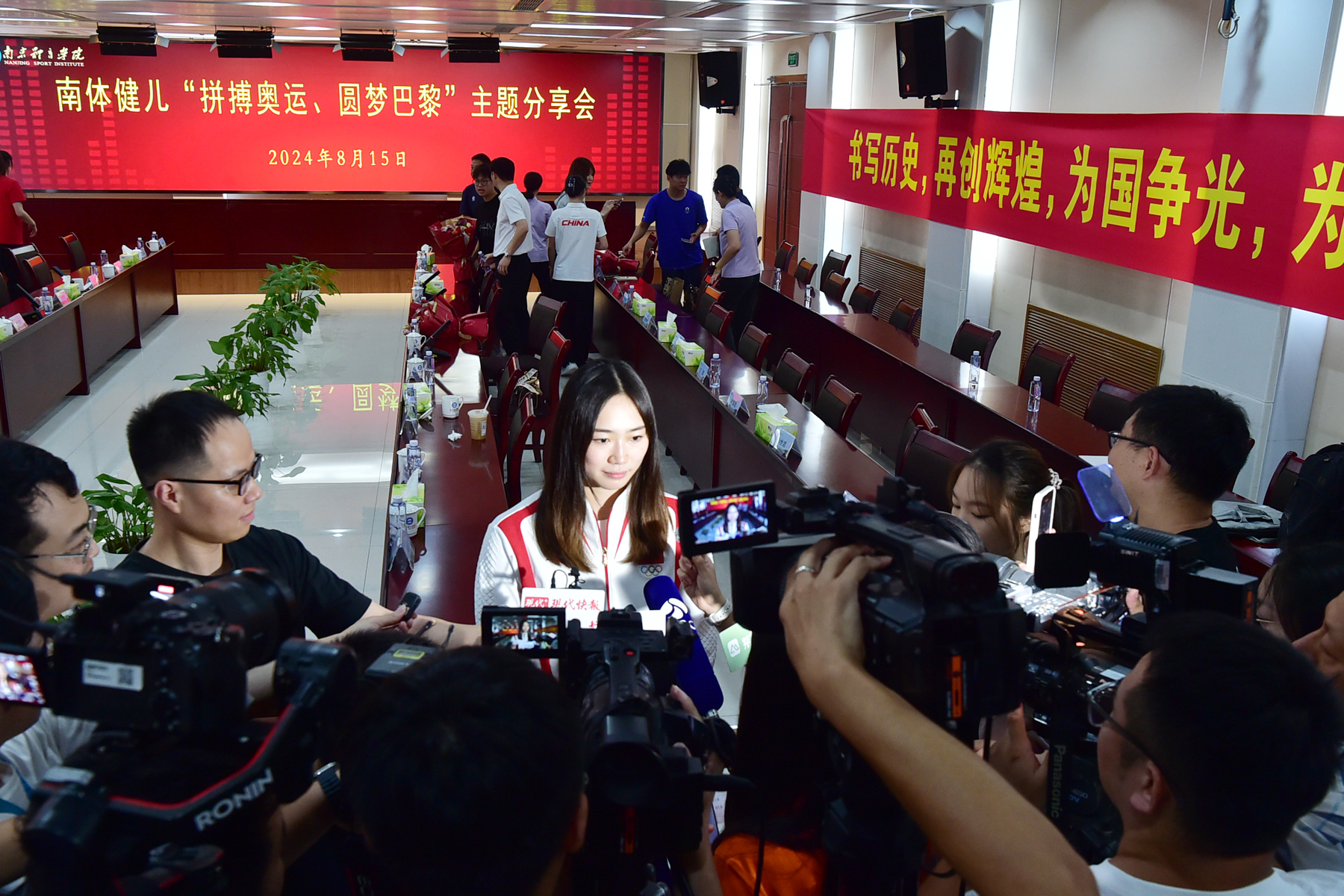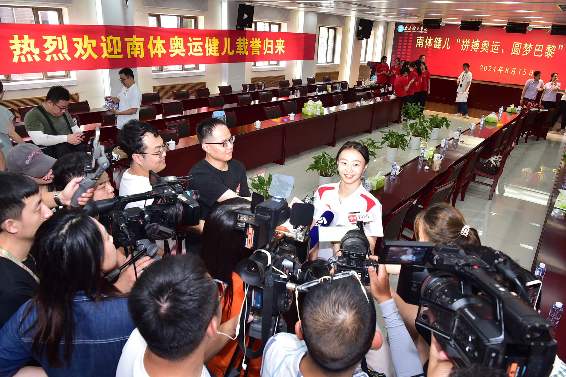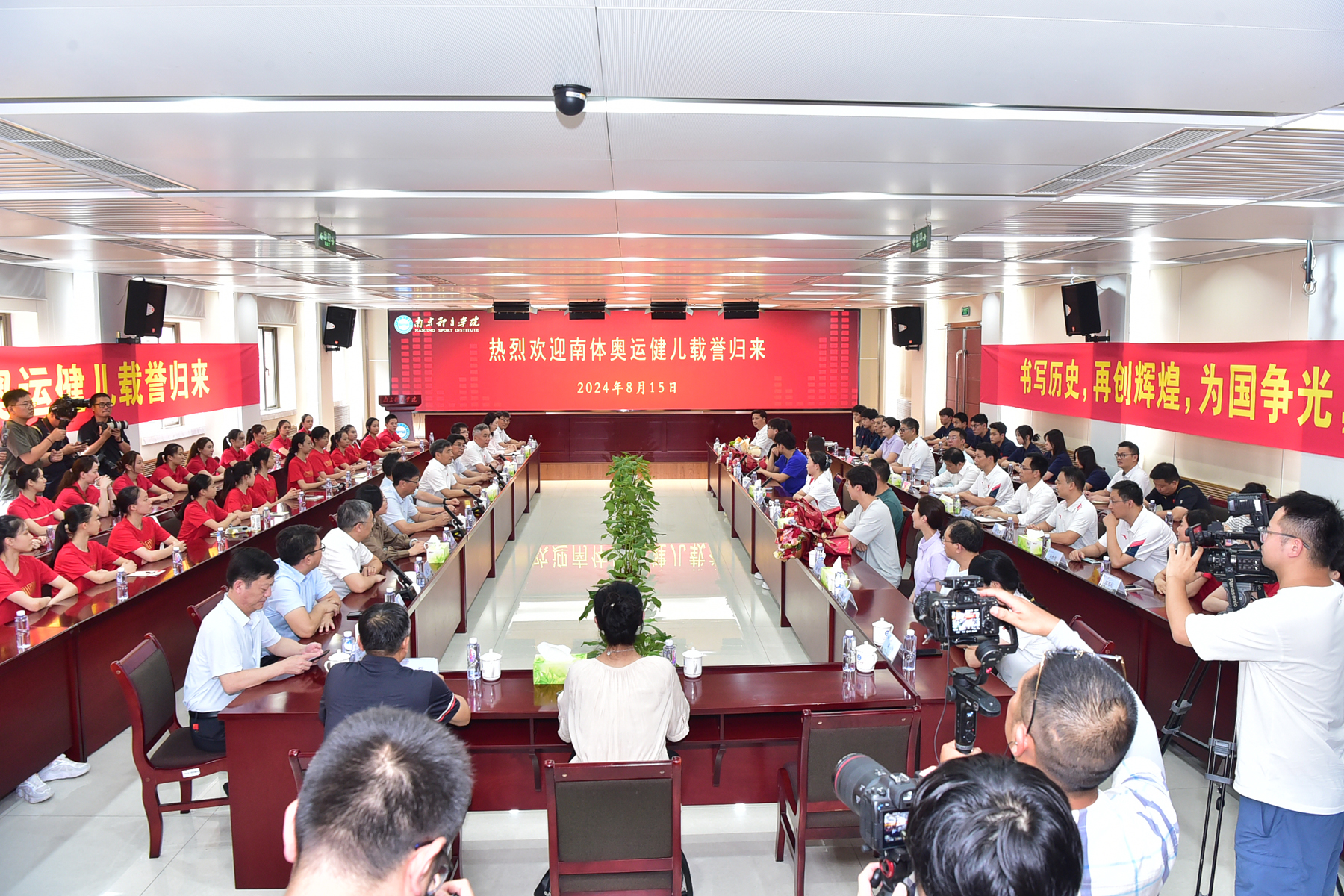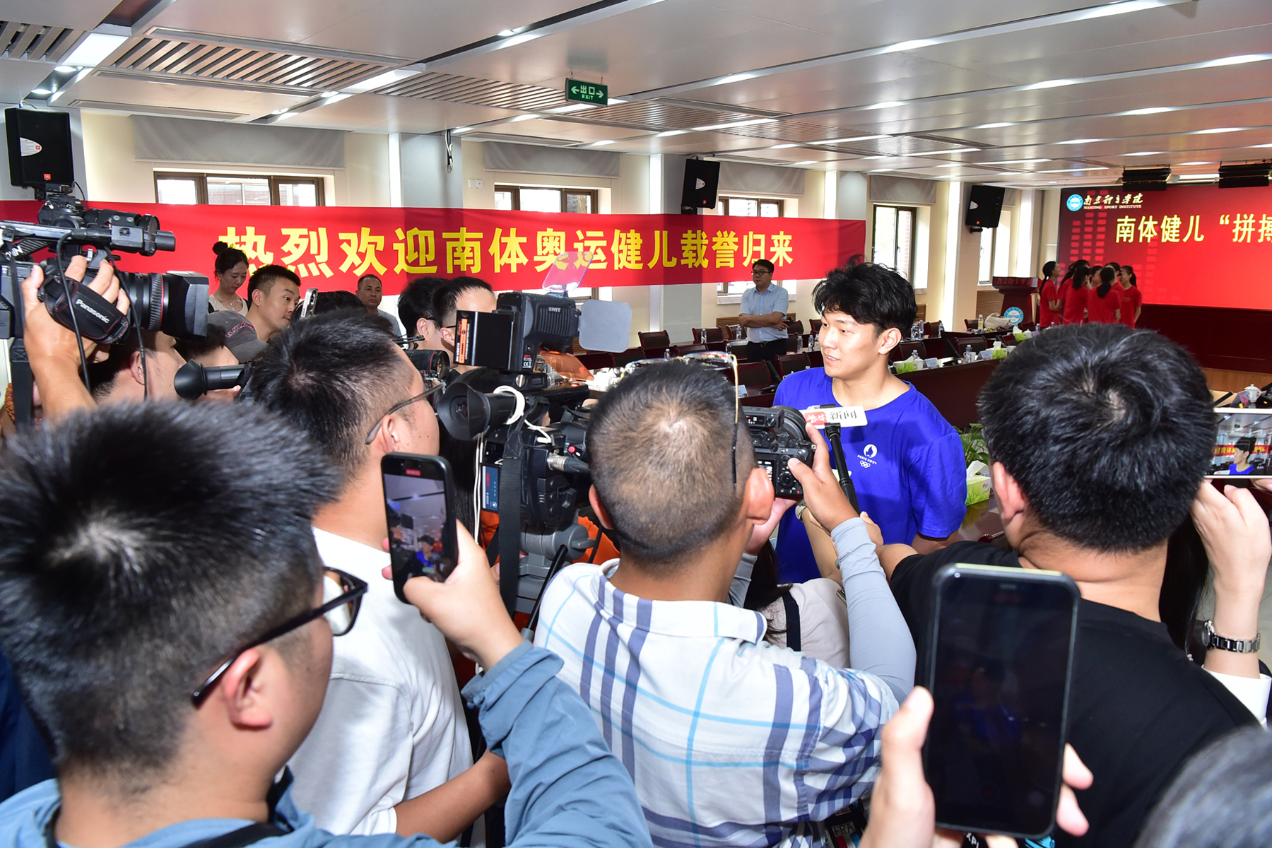 8月15日下午,南体花样游泳奥运冠军王赐月、艺术体操奥运冠军郝婷、奥运健儿董志豪,教练员季志祥、黄光裕和队医华天翼载誉回到南京体育学院,受到省、市体育局领导和南体师生的热烈欢迎。