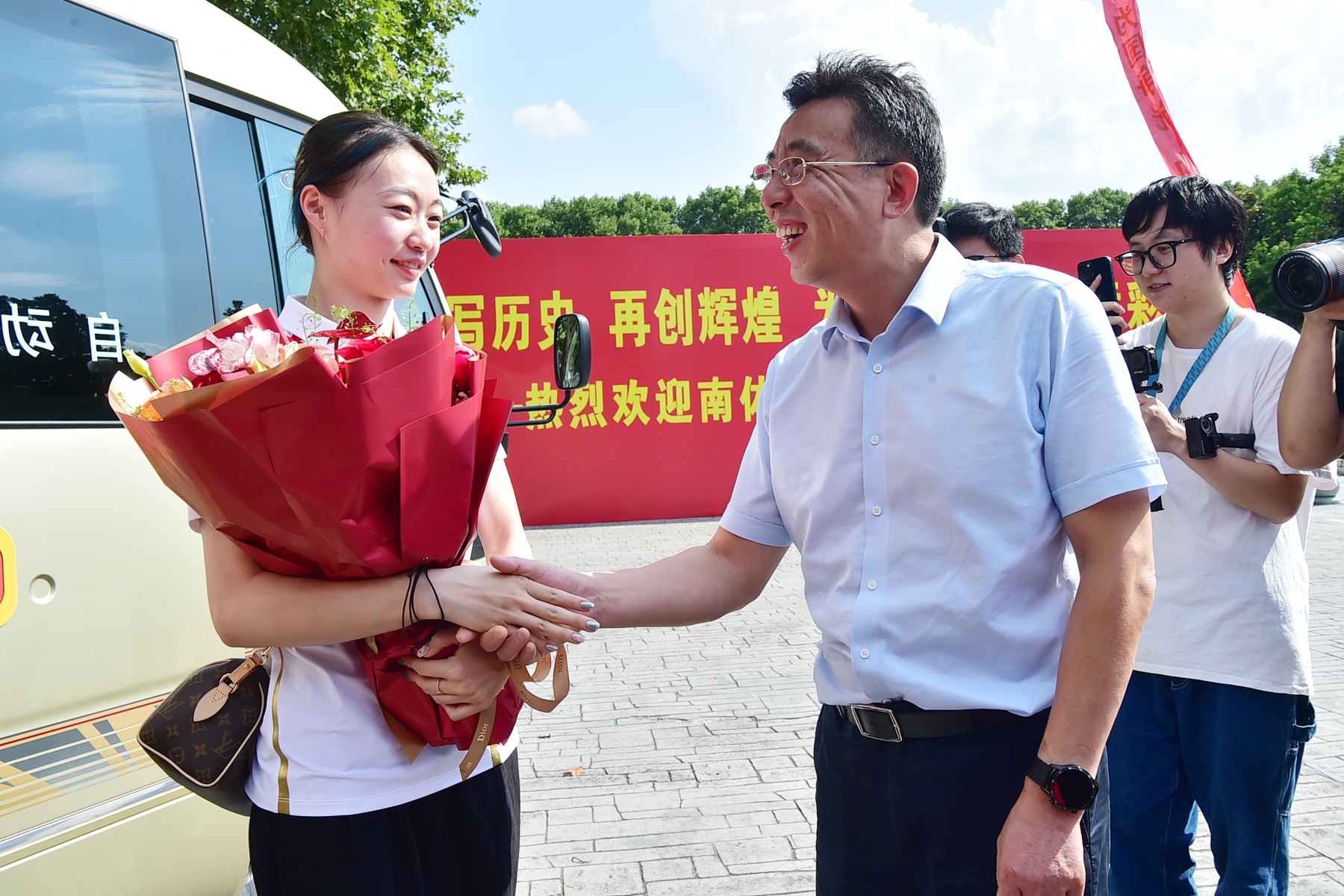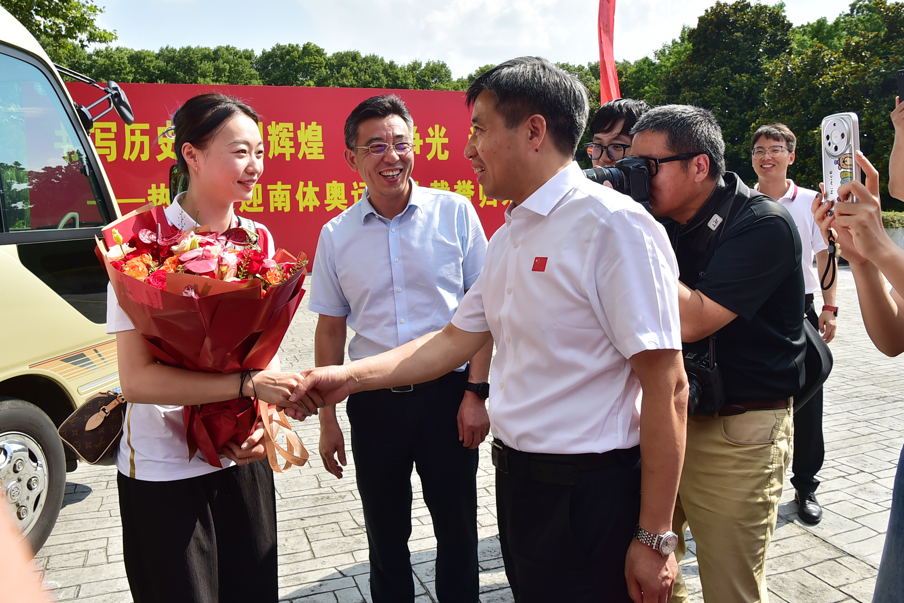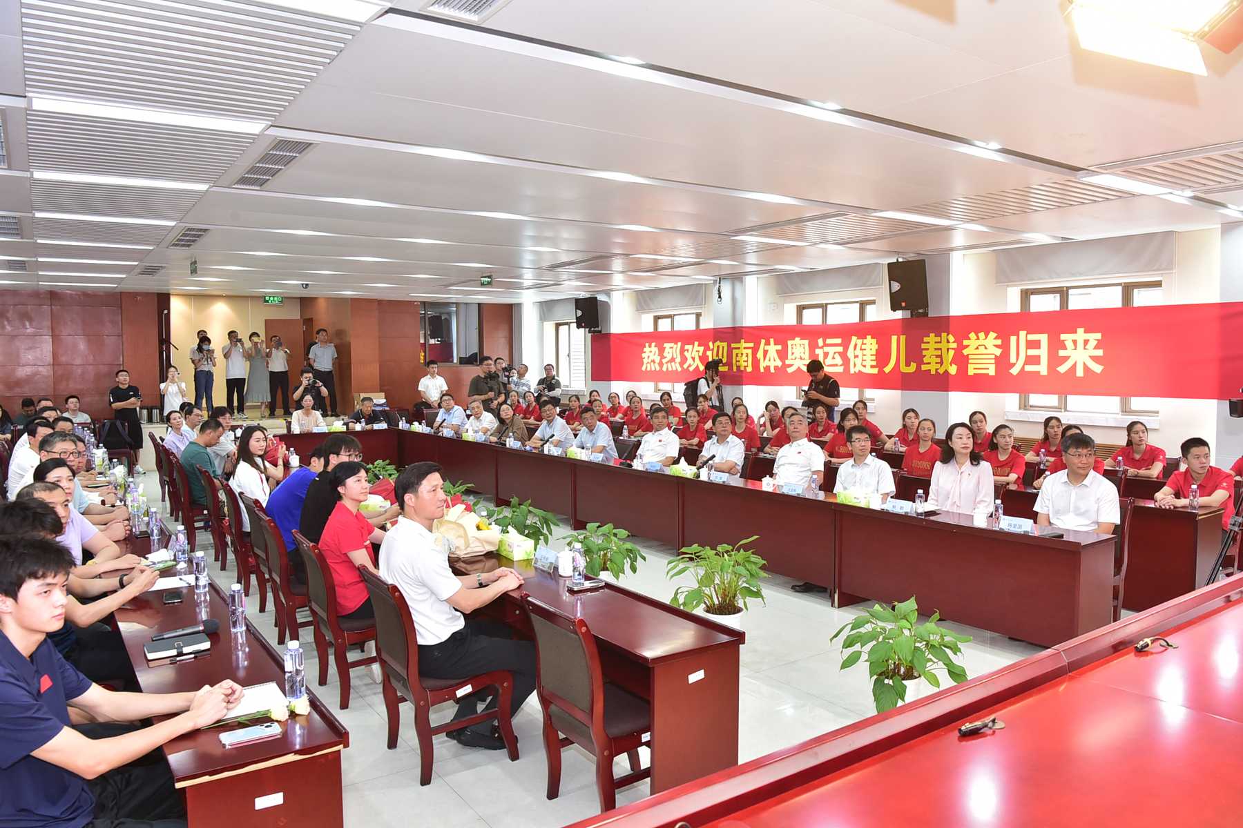 省体育局党组书记、局长陈少军,副局长刘彤,二级巡视员、竞体处处长许秋红;南京体育学院党委书记刘红明、校长杨国庆,校领导兰亚明、鲍勤、刘健、陈爱国;南京市体育局党组书记、局长董浩;盐城市体育局党委委员、副局长张德凯在南京体院灵谷寺校区会见了王赐月、郝婷和董志豪等并举行欢迎会。刘彤、杨国庆、许秋红、刘健、南京市体育局副局长葛菲、张德凯等到南京南站迎接凯旋的南体奥运健儿。