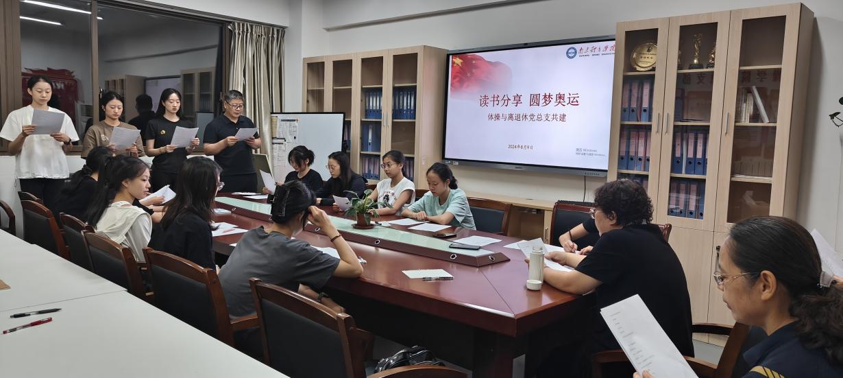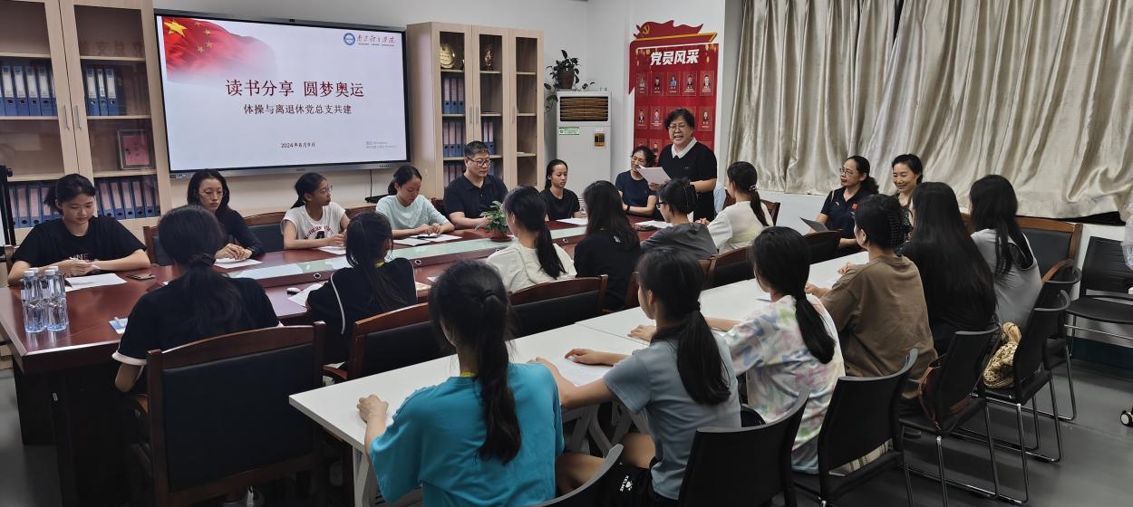 正值巴黎奥运会艺术体操项目比赛期间,为了加强运动员文化建设和爱国主义教育,同时为国家队决赛加油助威。在校关工委的关心支持下,8月9日晚上,体操学院党总支与离退休党总支在体操学院会议室举办了主题为“读书分享、圆满奥运”的共建活动。校关工委执行副主任李江、网球学院关工委执行副主任尤维娜、体操学院党总支书记谢长虹、离退休党总支副书记刘桂彩、体校退休教师焦苏英、体操学院副院长兼艺术体操队领队杨干和全体艺术体操队教练员运动员参加了本次活动。