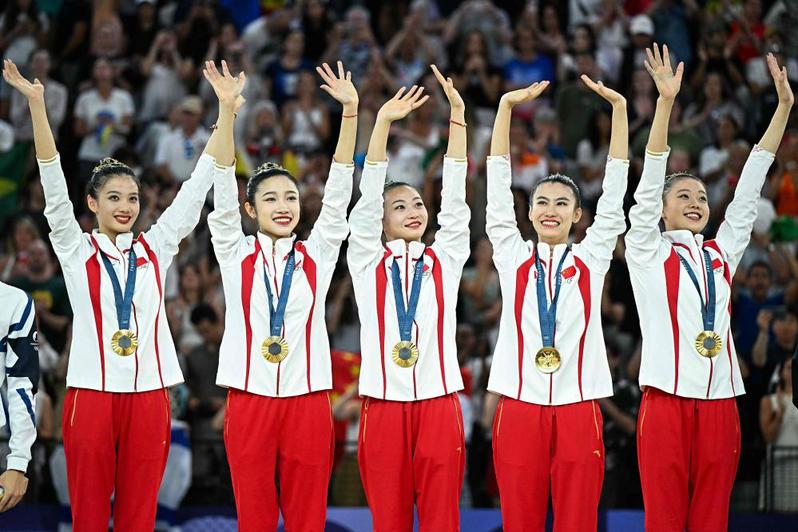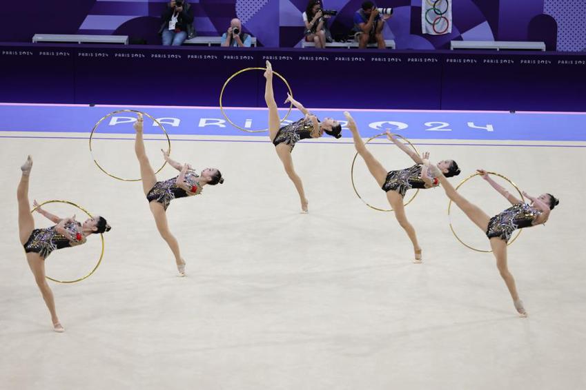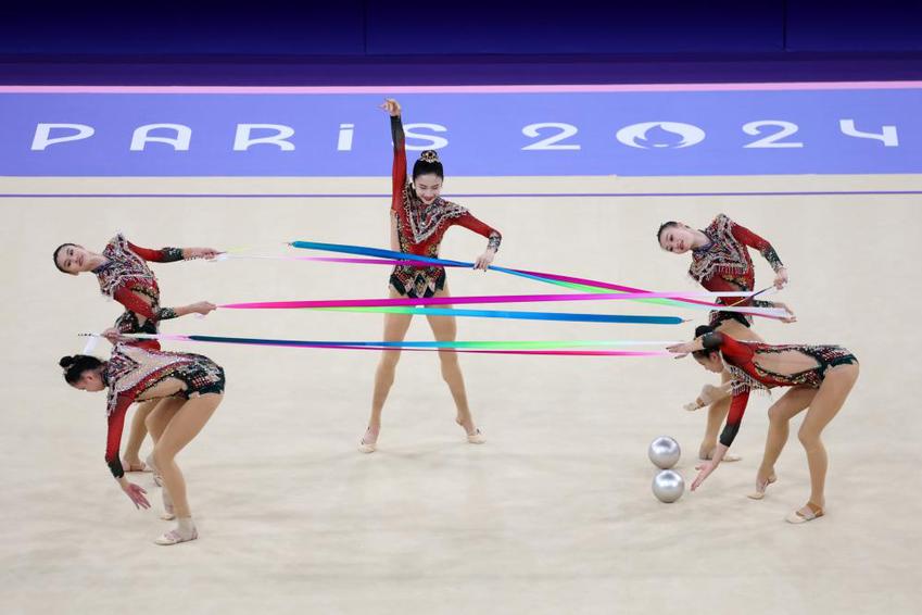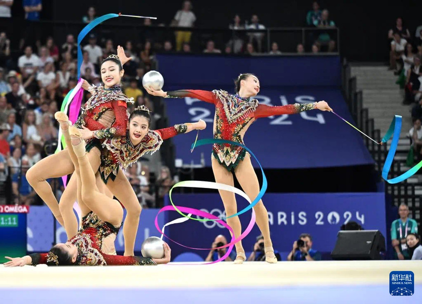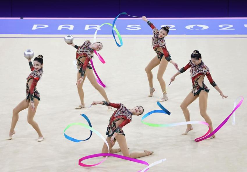 在决赛中,由郝婷/丁欣怡/郭崎琪/黄张嘉洋/王澜静组成的中国队在首轮的5圈项目中,带来以环保为主题、呼吁人与自然和谐共处的《共生共舞》,凭借流畅的表演、极高的动作完成质量获得36.950分,首轮结束排名第一。次轮3带2球项目中,中国队带来极具中国风韵味的《凤鸣凌霄》,以精准的动作、具有张力的表演诠释汉唐国风,获得32.850分。最终,中国队以总成绩69.800分斩获金牌,创造了该项目在奥运会上的历史最佳战绩。