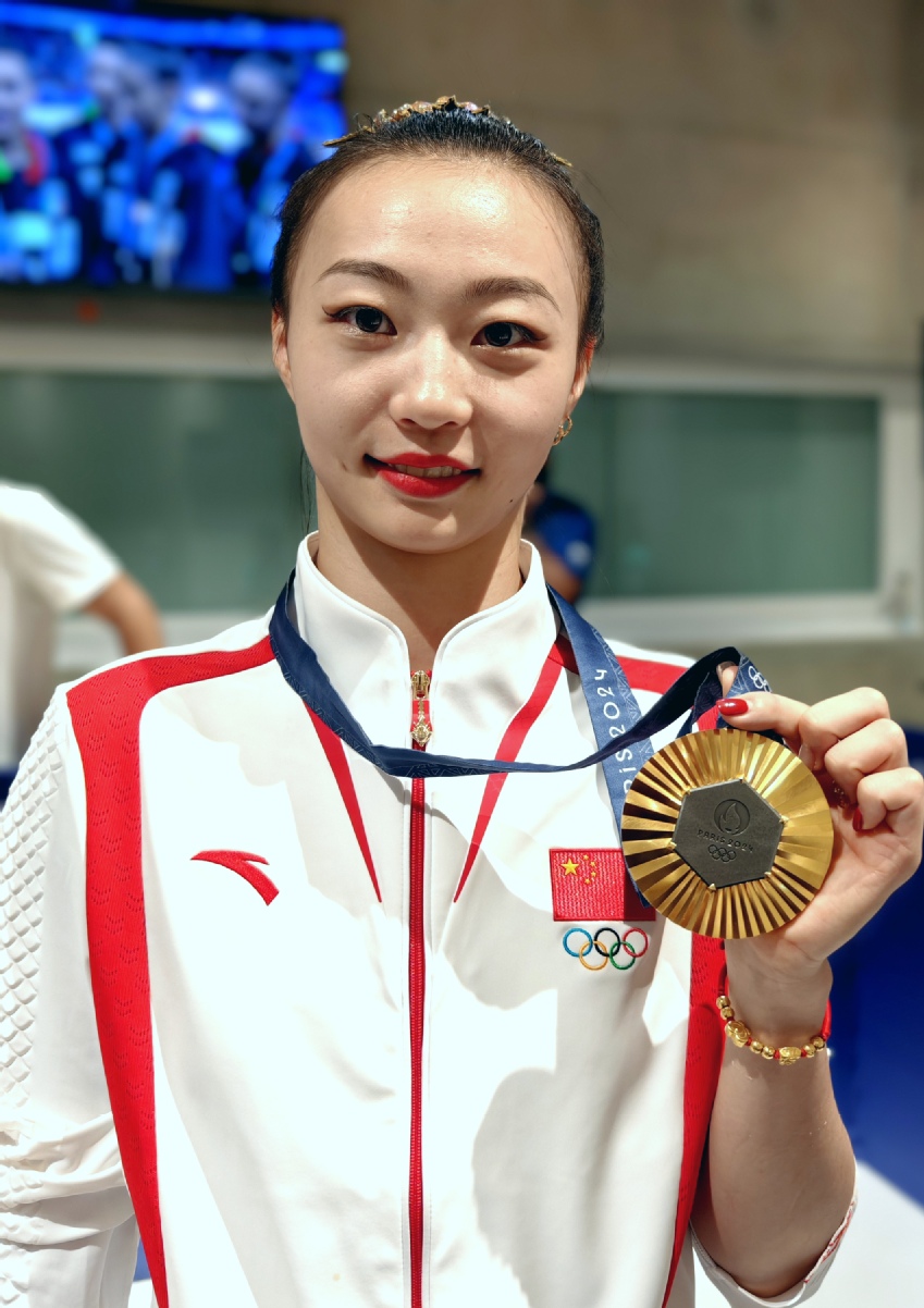 南体运动员郝婷展示获得的巴黎奥运会艺术体操集体全能金牌