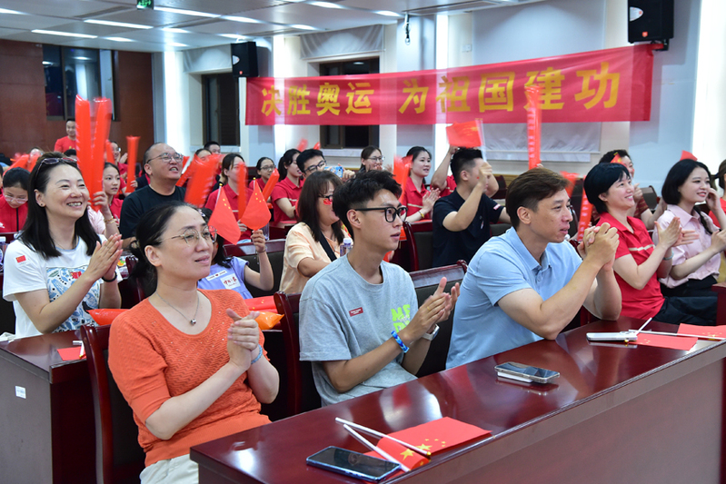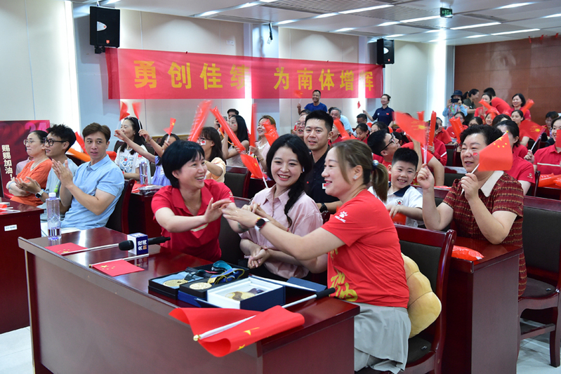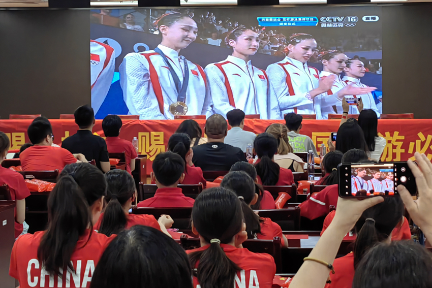 当天凌晨,南京体育学院党委书记刘红明、校长杨国庆和党委领导班子成员兰亚明、肖爱华、周和林、鲍勤、王猛、殷怀刚熬夜观看了比赛直播;党委常委、副校长刘健、陈爱国,党委常委、党委宣传部部长、党委统战部部长许立俊,部分机关干部,游泳学院管理干部和花游队全体运动员、教练员和工作人员在学校办公楼一起观看了花样游泳集体技巧自选决赛的直播。大家一起为中国花游队加油助威。