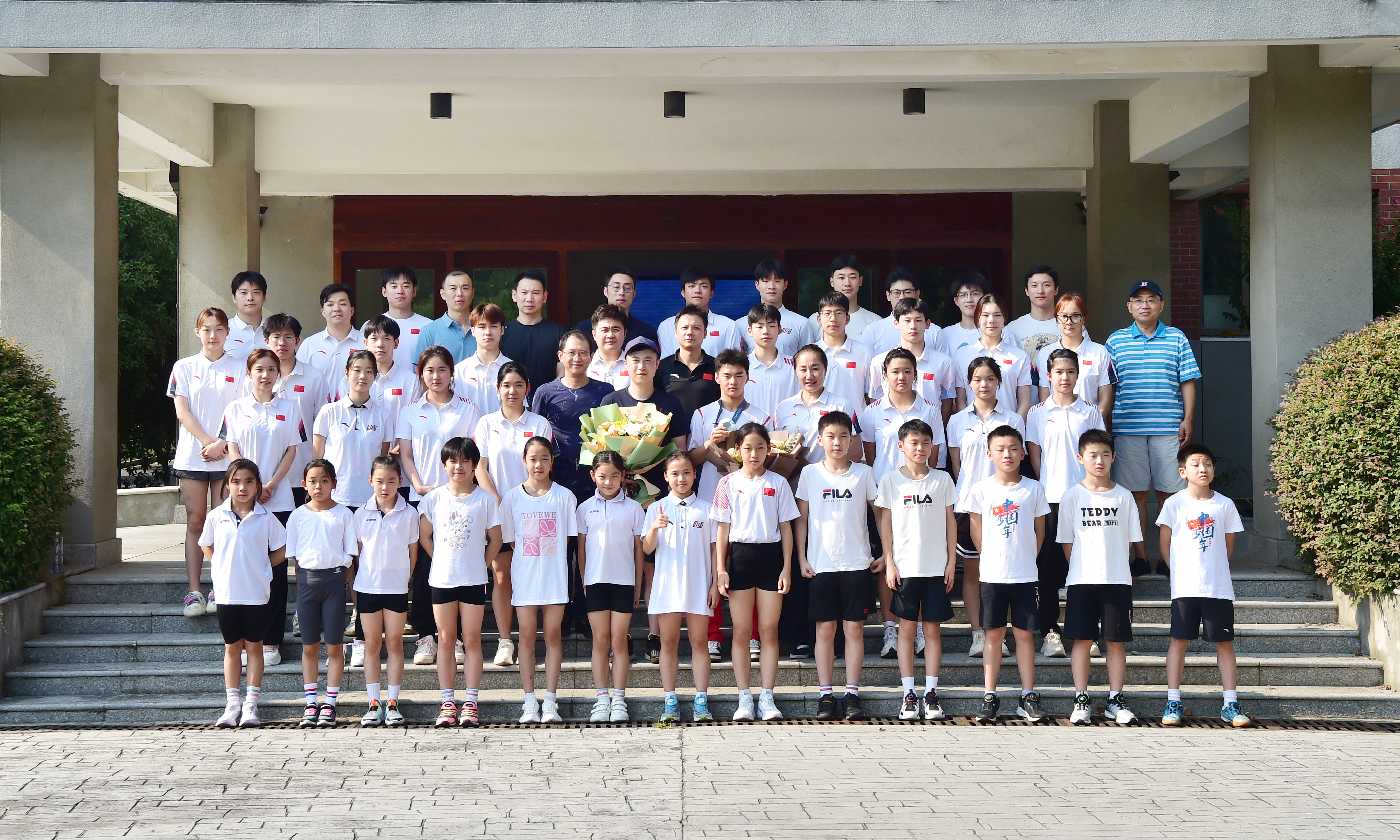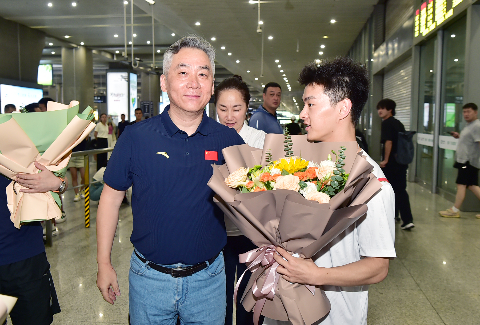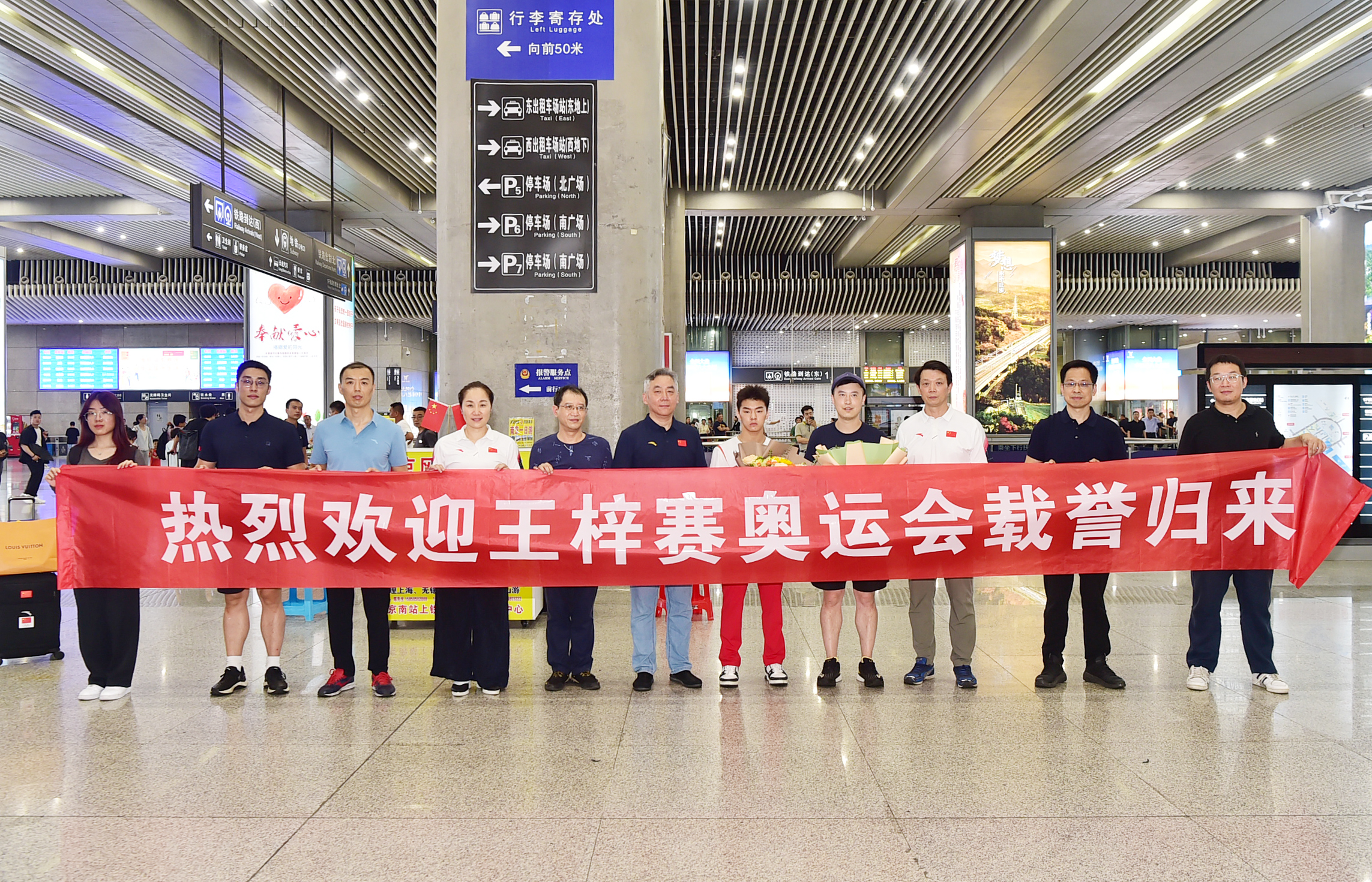 8月6日下午,刚刚在2024年巴黎奥运会蹦床比赛中荣获银牌的王梓赛与教练员胡俊雄返回母校南京体育学院。校党委常委、副校长刘健,党委常委、党委宣传部部长、党委统战部部长许立俊,党委常委、党政办主任王猛,体操学院党总支书记谢长虹、体操学院副院长兼蹦床队领队周丹、训练处副处长叶蓁等到车站迎接。