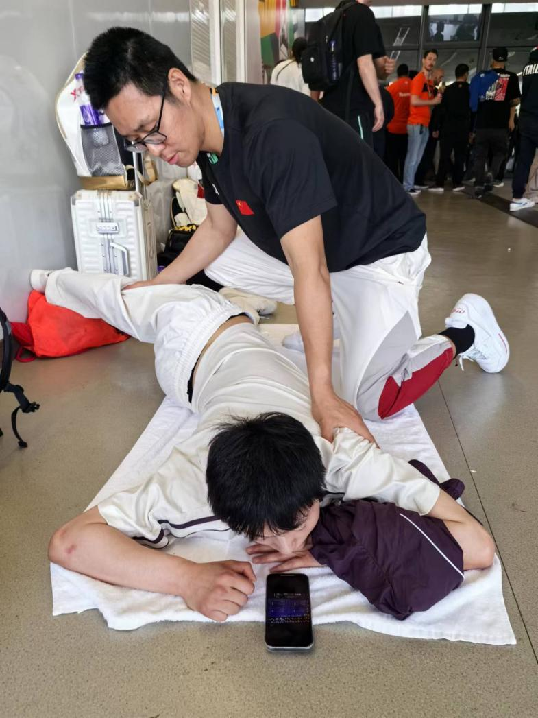 体能教练陶柳为蹦床运动员王梓赛进行康复训练