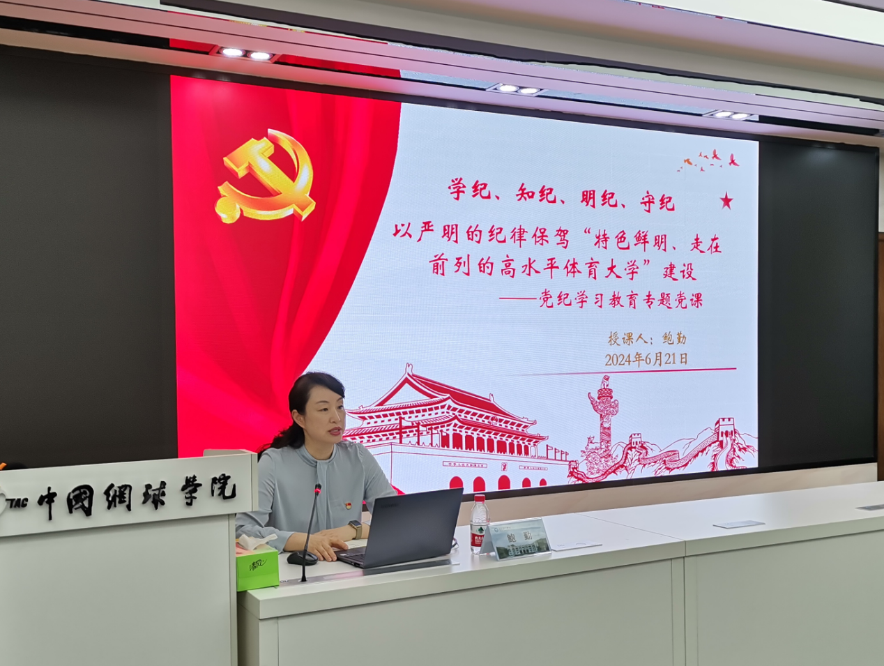 根据学校党委统一安排部署,为推动党纪学习教育走深走实,进一步教育引导全体党员学纪、知纪、明纪、守纪,6月21日下午,校党委常委、副校长鲍勤为大后勤全体党员同志讲授党纪学习教育专题党课。后勤处、基建处、计划财务处、招标办、审计处、资产管理处、网球学院、幼儿园、资产经营公司、南京钟山网球发展有限公司全体党员参加。