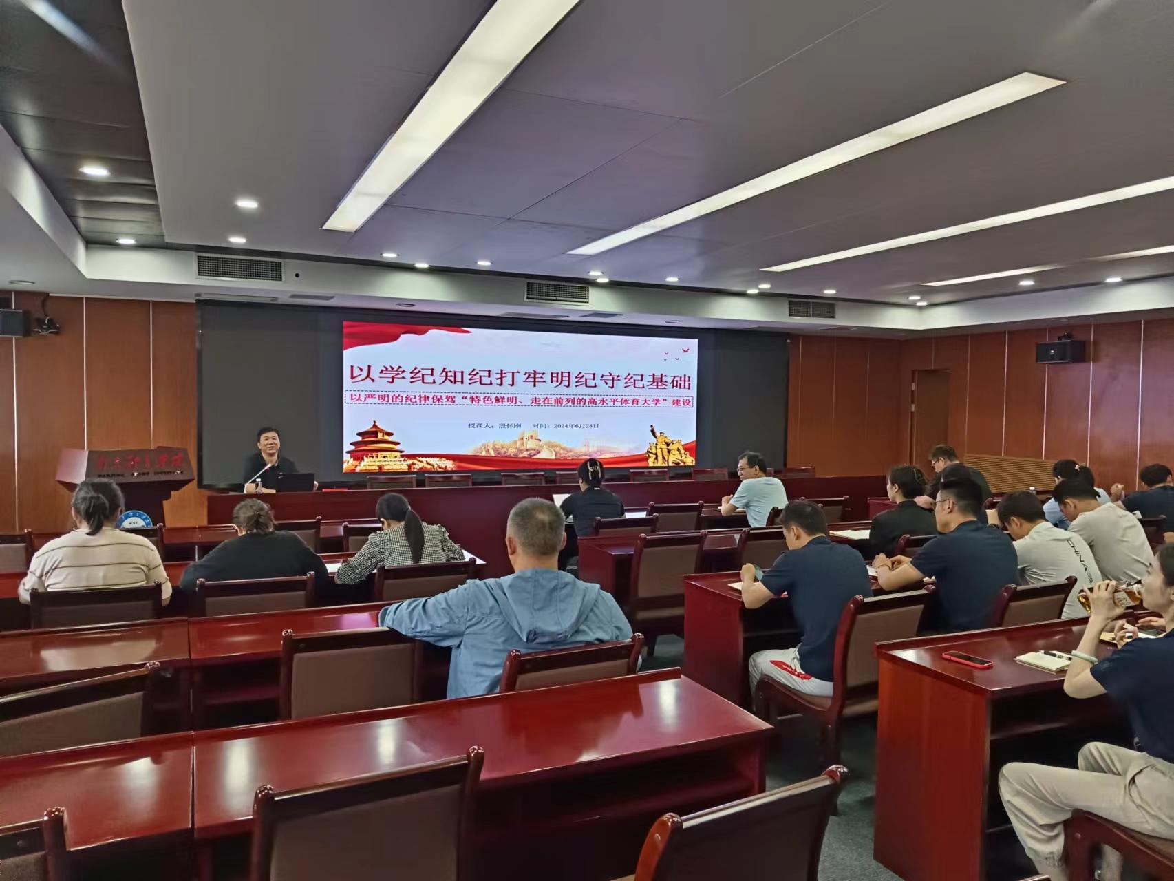 殷怀刚以《以学纪知纪打牢明纪守纪基础——以严明的纪律保驾“特色鲜明、走在前列的高水平体育大学”建设》为题,分“强根基、认识党纪学习教育重大意义,深研读、推动《条例》学习入脑入心,重行动、保持政治清醒强化履职担当”三个章节为党员授课。课程中,既讲授了党的纪律建设在党的发展历程、新时代现实发展需要、高校高质量发展中的极端重要作用,又阐释了“六项纪律”的主旨要义和规定要求,并分析典型案例达到举一明三的警示效果。