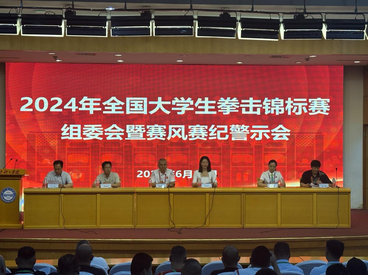 6月18日下午,2024年全国大学生拳击锦标赛组委会暨赛风赛纪警示会在南京体育学院图书馆报告厅召开。中国拳击协会竞赛青少推广部部长焦苏斌,南京体育学院党委常委、副校长肖爱华,江苏省拳击与空手道管理中心副主任陶晓东,南京体育学院运动训练学院院长赵琦以及本次比赛技术代表李霞出席会议。会议由南京体育学院党委常委、党政办主任王猛主持,全体参赛队伍领队、教练员参加会议。