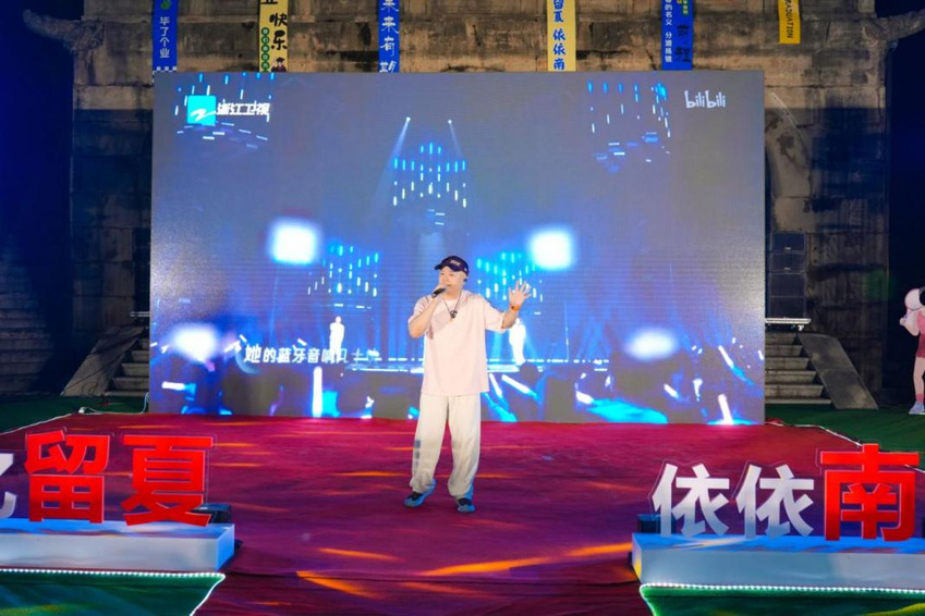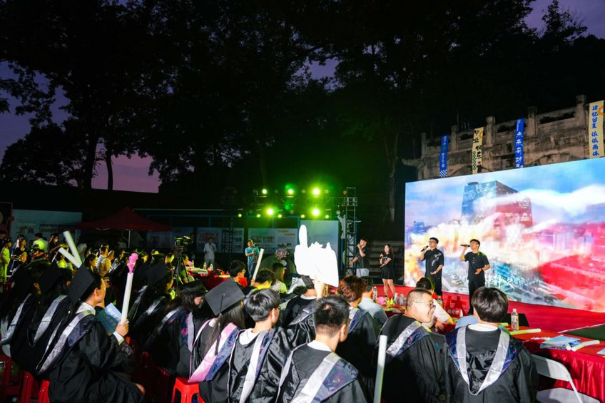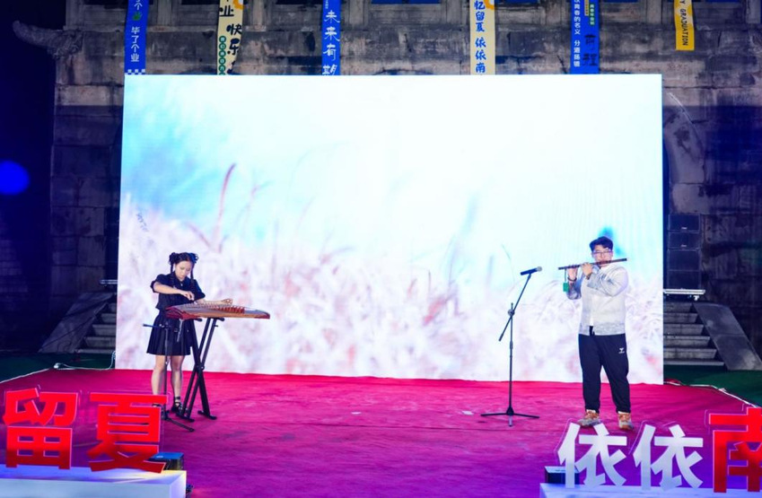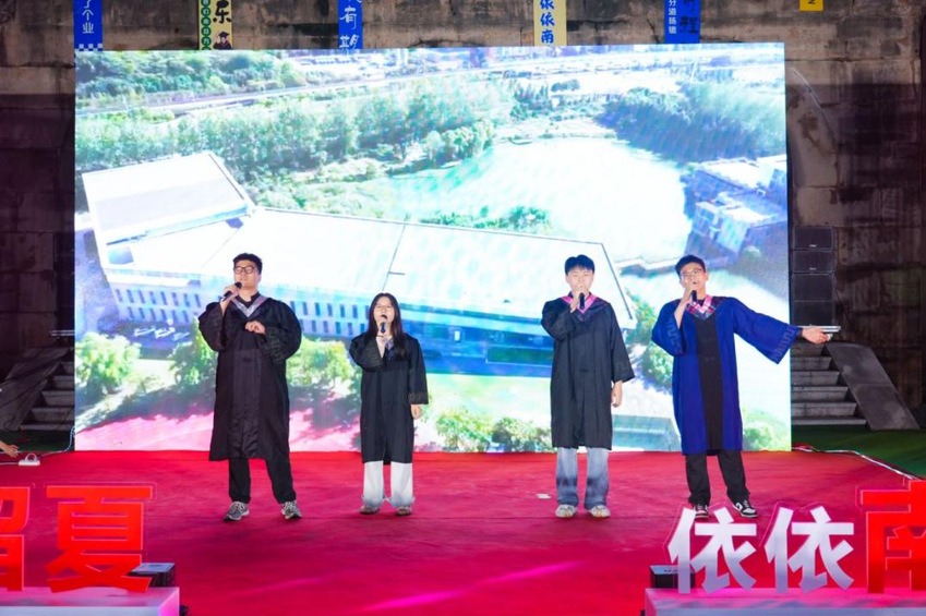 晚会伊始,大屏幕上播放着领导、老师和学弟学妹们对2024届毕业生的祝福视频,晚会由“聚·梦想启航”“溯·青春芳华”“赴·人间山海”三个部分组成。在闪烁的镁光灯和动感的音乐中,开场歌曲《真的爱你》将大家带入到毕业晚会的氛围中。热情似火的集体舞表演《DDU-DU DDU-DU》展现了当代大学生的青春活力,《那些年》《那些花儿》《我只在乎你》带领全场毕业生走进了关于青春的追忆,重拾美好的校园时光。跟随优美的乐曲合奏的《青花瓷》旋律,现场仿佛置身江南水乡,《二十二》唱出了毕业生们对未来的期待和对不确定因素的迷茫,耳熟能详的歌曲串烧《最炫民族风+上春山+相亲相爱》引发了同学们的共鸣,铿锵有力的诗歌朗诵《今天我们这样爱国》表达了毕业生们的爱国情怀。顾忠科老师演唱的歌曲《若月亮没来》鼓励毕业生们在今后遇到挫折时积极面对,不要遗忘了最初的自己。由学校鼓韵飞扬团队带来的演奏《年少的你》和Tab乐队带来的歌曲《海阔天空》将晚会的氛围推至高潮,在《凤凰花开的路口》和《再见》的歌曲声中,晚会落下帷幕。