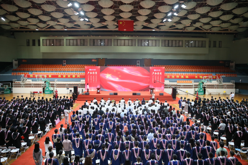 典礼正式开始前,同学们演唱了暖场歌曲。与朋友分别的不舍、对往事的回望、站在新起点的期盼与迷茫……旋律刚起,就引起了全场师生的共鸣。大家跟着节奏挥舞手拍,不时发出欢呼,气氛燃爆了整个体育馆……这一场理智的狂欢,是属于同学们的青春盛典。